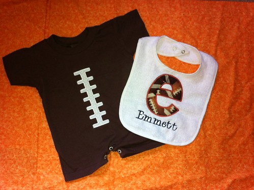 And a set I made for my husband's coworker who just had a baby boy and is a HUGE football fan. The birth announcement was deigned to look like he was the newest recruit for the Chicago bears so I think they will like it. Now if it could just warm up to romper weather around here.