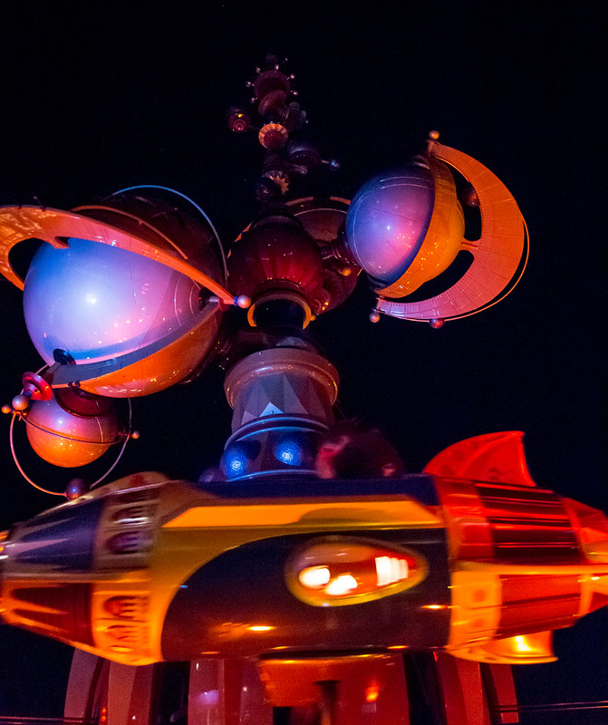 We picked out a spot in the hub, which was already getting quite full, and staked our little slice of sidewalk to wait for the fireworks, which were still quite a ways away. I want to say we were at least an hour before showtime. To pass the time, DS asked to ride Astro Orbiters, so they let me with the stroller holding their spot mostly and went to ride.