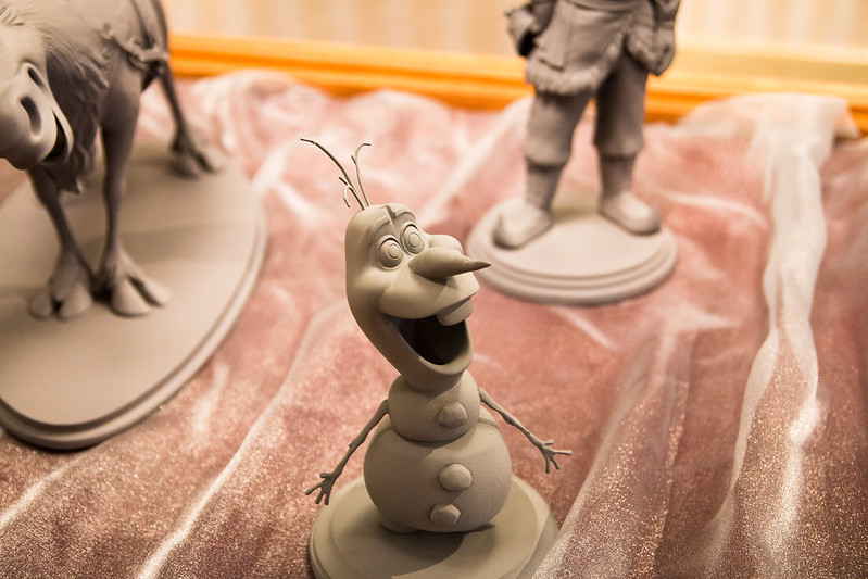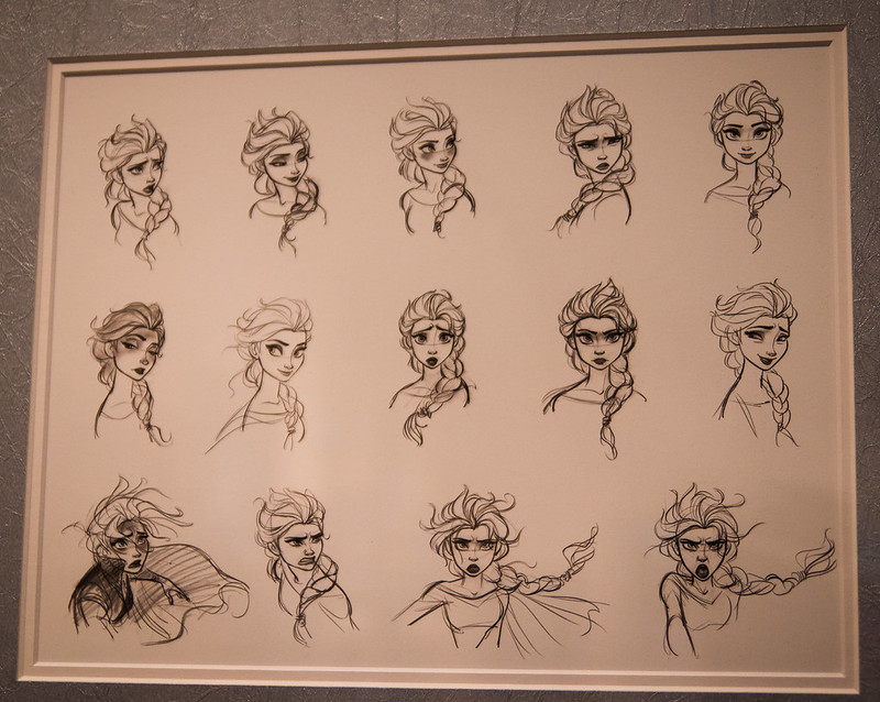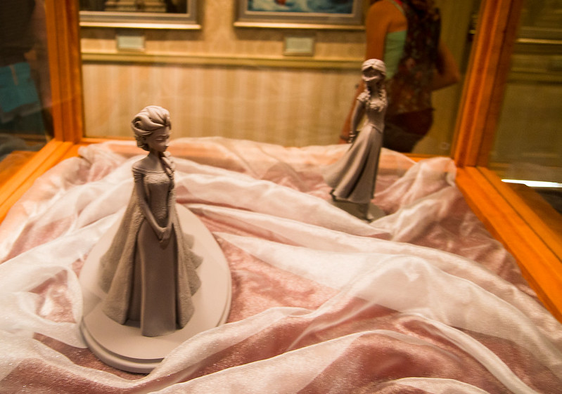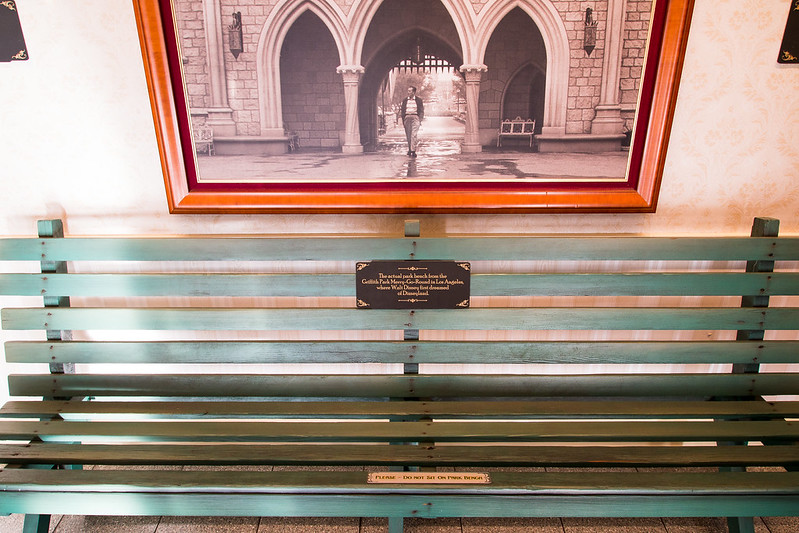 After the parade, we stopped inside the building for Great Moments with Mr. Lincoln to see an art exhibit featuring Frozen. Right inside is the bench where Walt sat watching his daughters ride the carousel where he got the idea for Disneyland.
