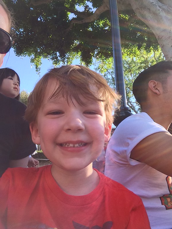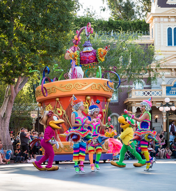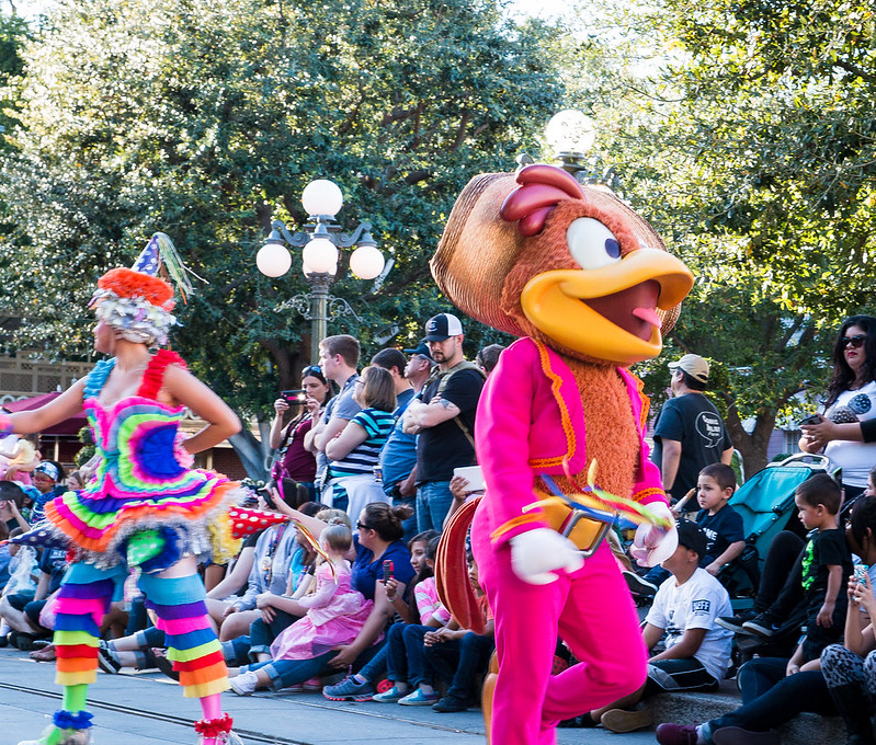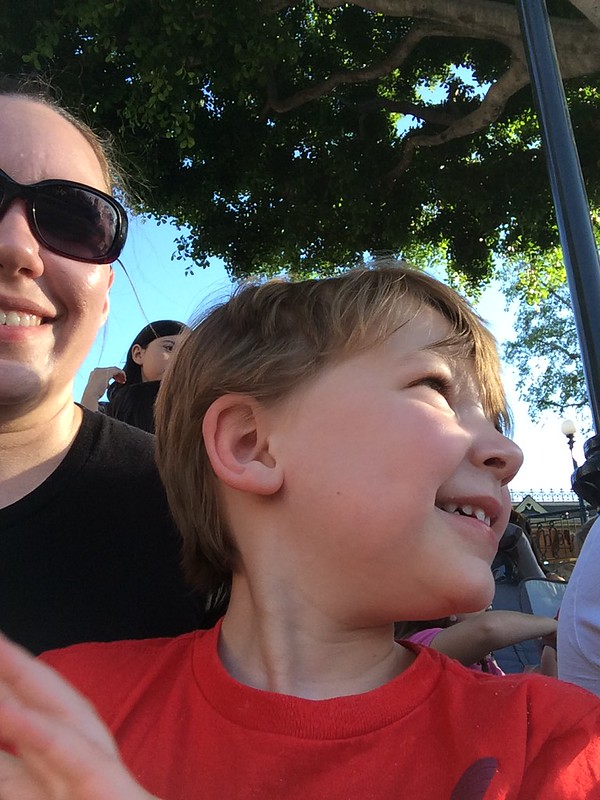 After a nice break back at our resort, we left and got to the Toy Story lot and took the bus back, making it into the park at 3:55 for the 4 pm Mickey’s Soundsational Parade. Amazingly, we found a spot right there on the curb! But we had to wait a bit before the parade got to us. In Disneyland, the starting point of the parade alternates between Main Street and Small World. Since it had gone from Main Street to Small World the day before, today it was starting at Small World and ending at Main Street. While we waited, DS took a million selfies.