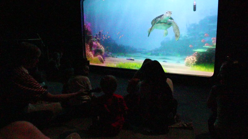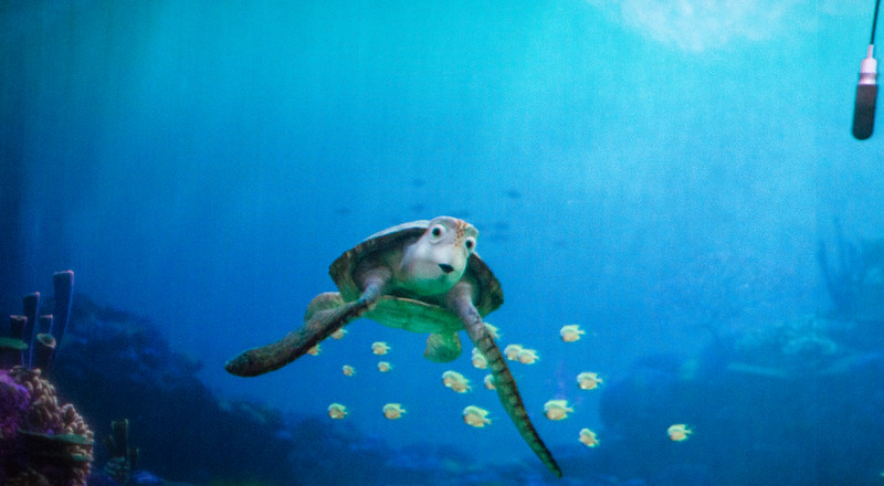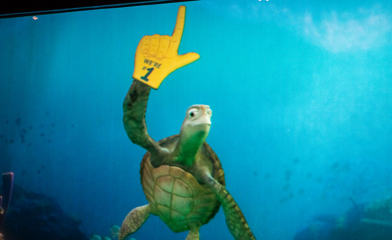 Once we got over to DCA, we hustled over to catch the next Turtle Talk show. We have only done this once before in WDW, and at the time DS was still pretty little and too afraid to sit down on the floor with the other kids. This time though he was happy to head down there instead of sitting in the seats with DH and I. I already knew I was going to love our emcee when he said the hydrophone Crush would be using was left over from the Dharma Initiative. Lmao!
