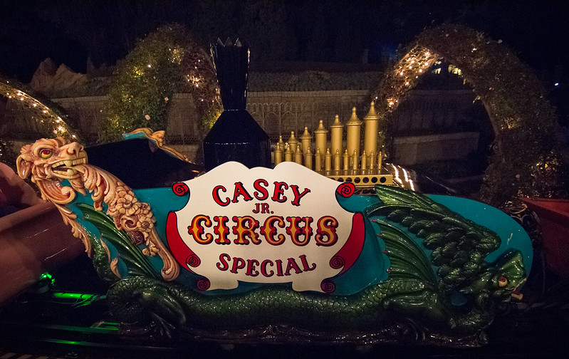 DS spotted the Casey Jr. train and wanted to ride again, and the line wasn’t too long, so we did that again. It was interesting after having ridden it that morning to see everything lit up at night instead.