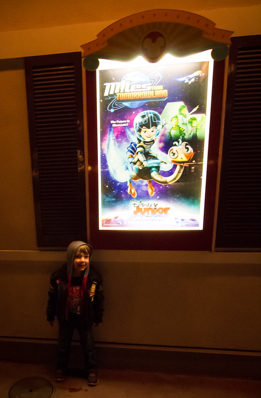 Then we were ready to exit the park. On the way to the bus stop, DS spotted the Miles From Tomorrowland poster that DH had taken a picture of the night before and of course, wanted his picture taken with it.