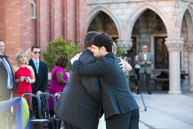 Suddenly the Space Mountain queue music faded out, and A Thousand Years by The Piano Guys came over the speakers. After months and months of listening to the song on repeat during my commutes, imagining and visualizing how this would look, the moment had finally come. As discussed at the rehearsal, Kristie queued each person when to walk but took her queues on when to send Kevin's parents/the men/the girls/the ring bearer from me based on when I heard what I was looking for in the music.