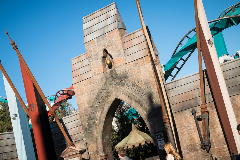 I ended up not staying there long because almost as soon as DH and DS left, the kid next to me on the bench starting spazzing the eff out when his mom left him with his grandma in the child swap room so she could go ride. He was probably about 5 or 6, so way too big for his grandma to handle and he came close to kicking me and DD a couple of times. So we hurried out of there! Meanwhile, DH and DS were getting on Flight of the Hippogriff.