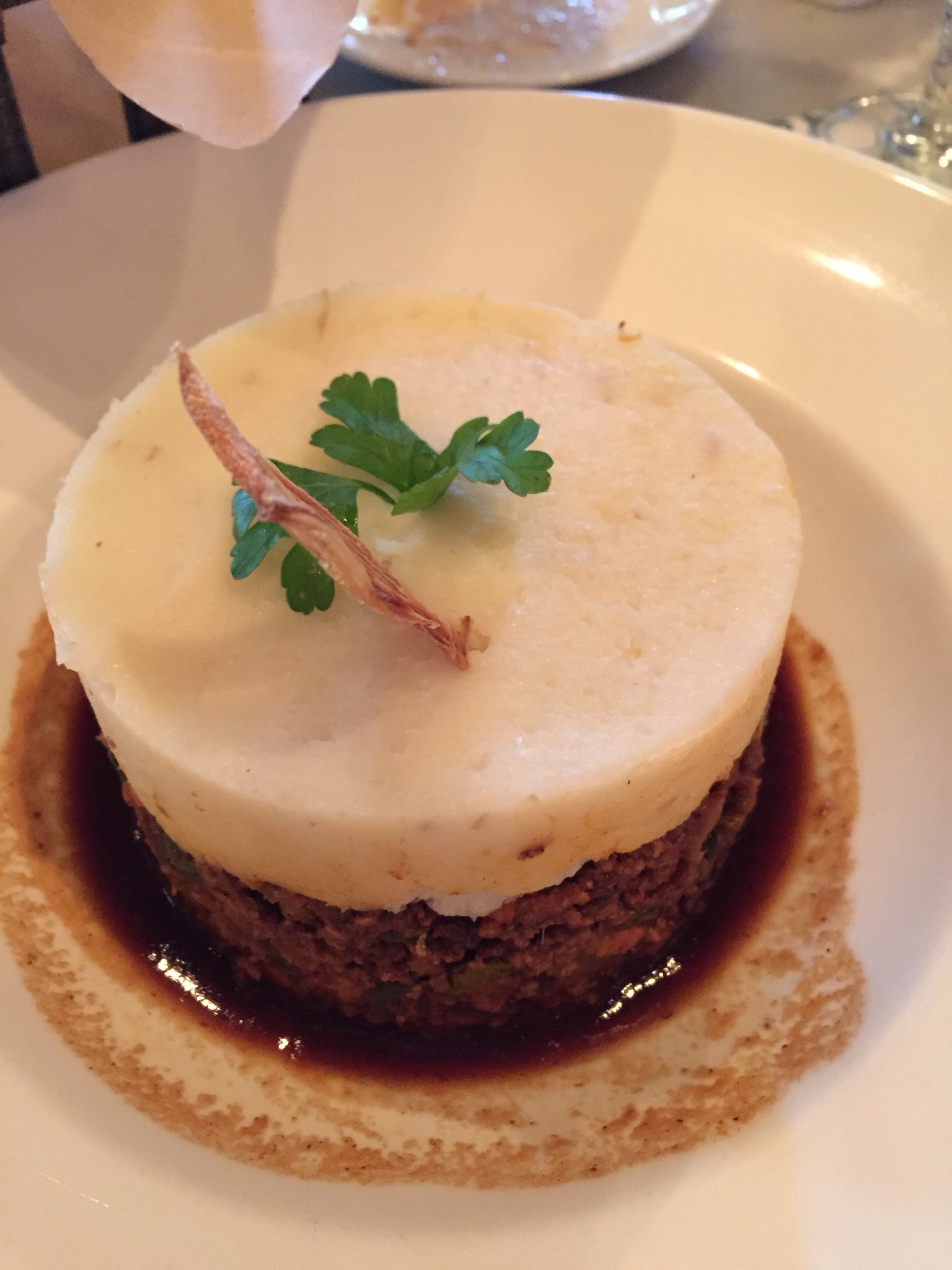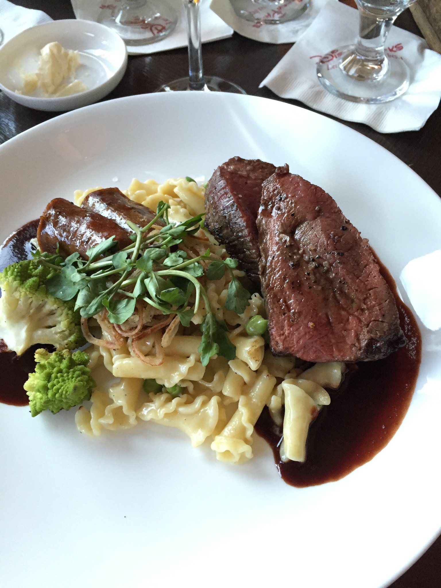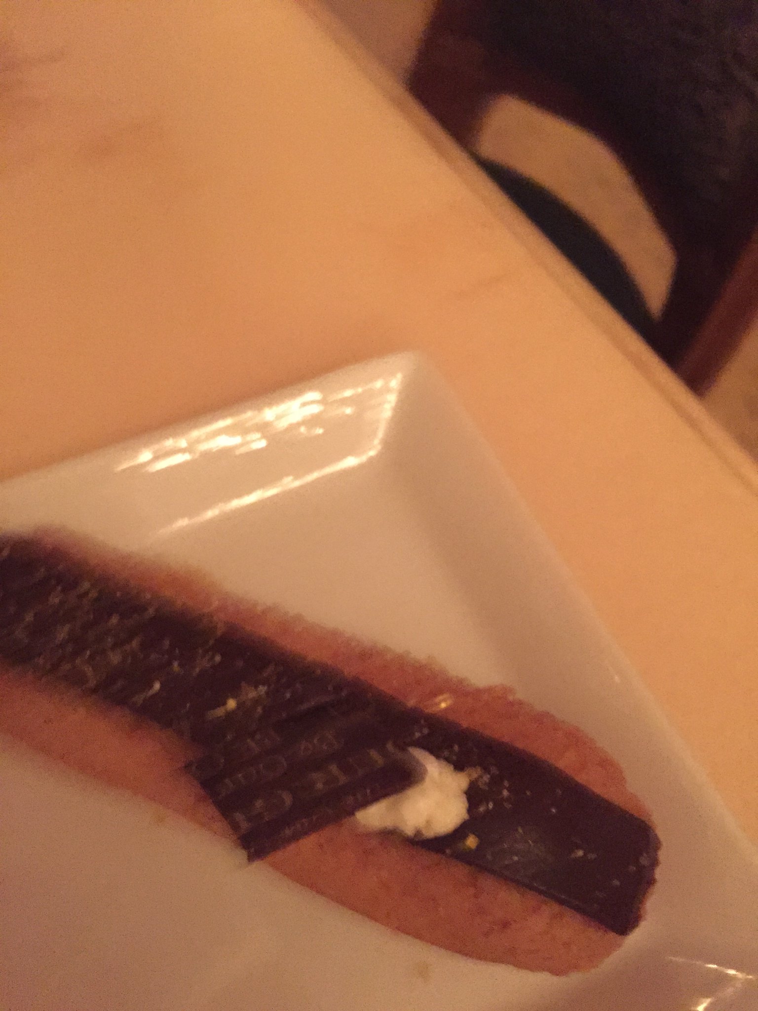 Aged Buffalo Strip Loin, with buffalo sausage, macaroni and cheese romanesca, crispy shallots, and black currant demi. I really enjoyed this, though I wasn't a huge fan of the sausage - it was a little spicier than I wanted and because of the dryness of the wine it was a biiiiit too hot for my tastes. But the rest of it was yummy! I'm really glad I went with this and not the Cornish hen like I nearly did, because that's something we make at home on rare occasions and this was something so completely different.