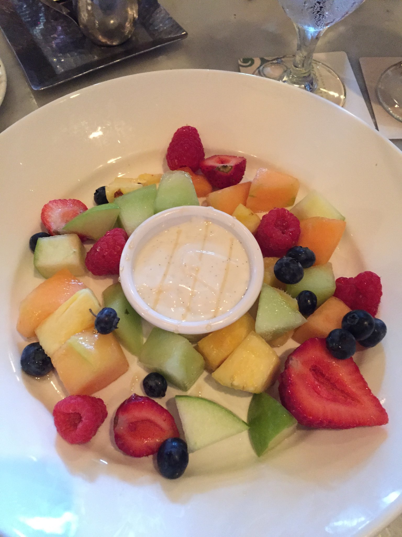 Our waiter was named....Izzy, I think? He'd been working there for a while and had his repartee down pat, and was a really good, attentive waiter without being too on you. I don't normally get alcohol in Disney in the summer but since I was so wound up I got myself a glass of the Sokol Blosser Evolution White, which is a mix of pinot gris, white riesling, muscat, gewurtztraminer, muller-thurgau, semillon, pinot blanc, sylvaner, and chardonnay grapes (phew!). It was a little dryer than I had thought it was but it meant that I slowed down and actually enjoyed it.