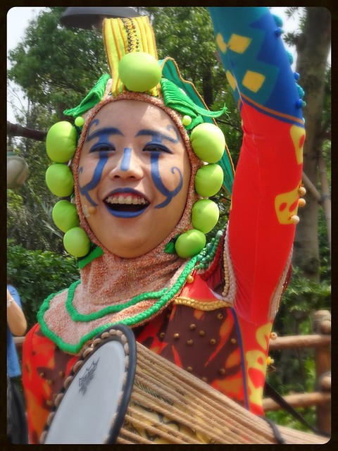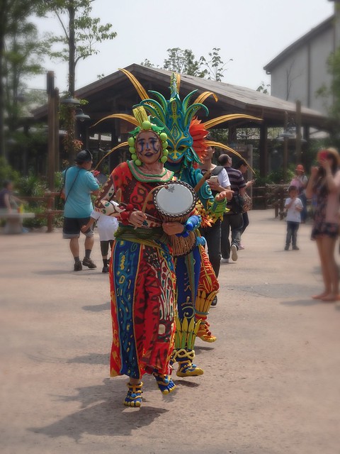 The Tarzan theatre was tucked away off the path near Soaring. It didn’t look like there was anyone in line yet, so I thought I’d have time to check out the FPs again before joining the line. The line was still too long for my liking (especially since I was on my way to a show), so I gave it a miss and headed back to the theatre. As I entered the area, these colourful musicians appeared from around the bend.