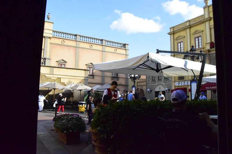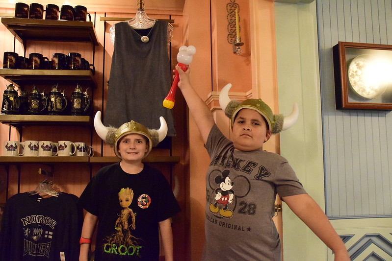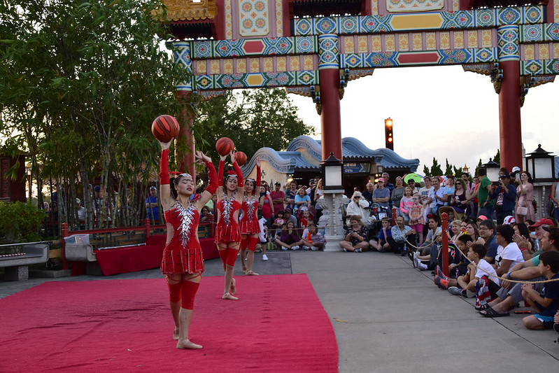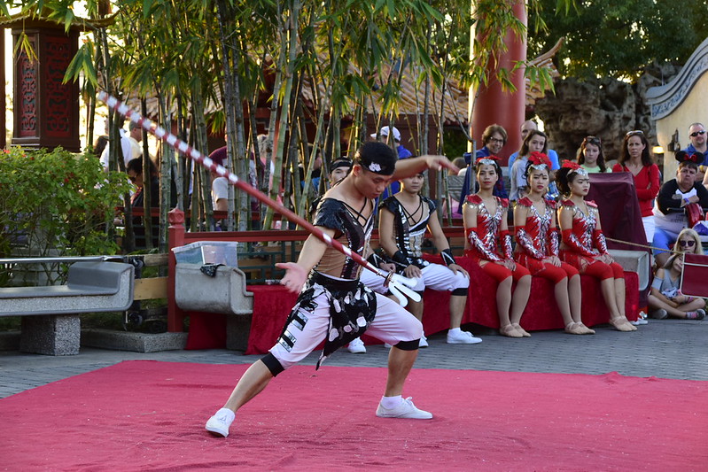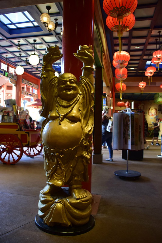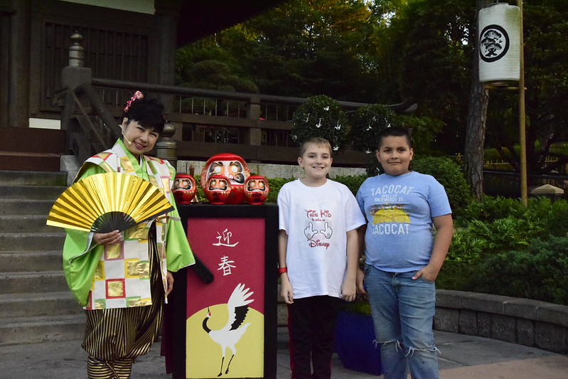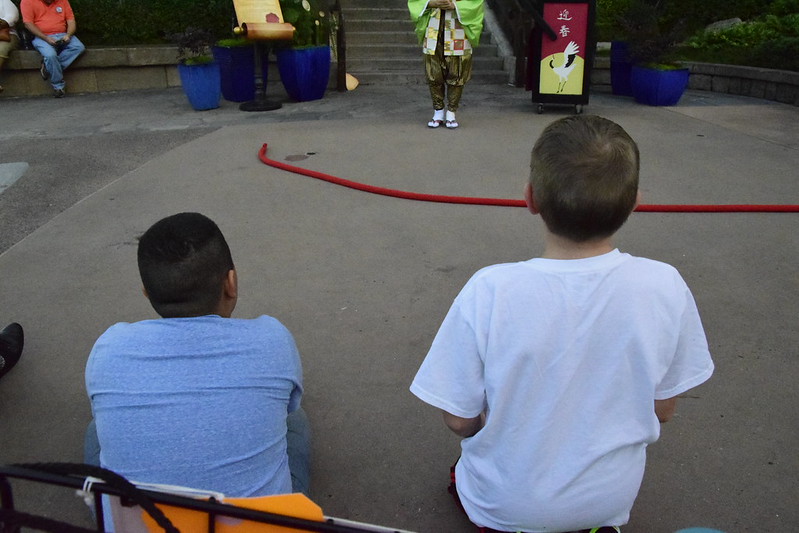 While everyone finished up their desserts I paid our "bill", the tip. Free dining is not free! The boys were antsy so I took Mikey and Z down with me and they ran down the steps. They had some energy to burn. As i got my ECV I noticed that the Daruma Vendor was getting ready to start so we sat and watched.