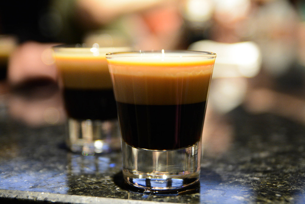 Baby Guinness. The Kahlua was already poured in the shot glasses, and we added the Bailey's Irish Cream. It's a very sweet, chocolatey-tasting shot. Max loved it so much that he purchased Bailey's and Kahlua in Cozumel so that he could make more!