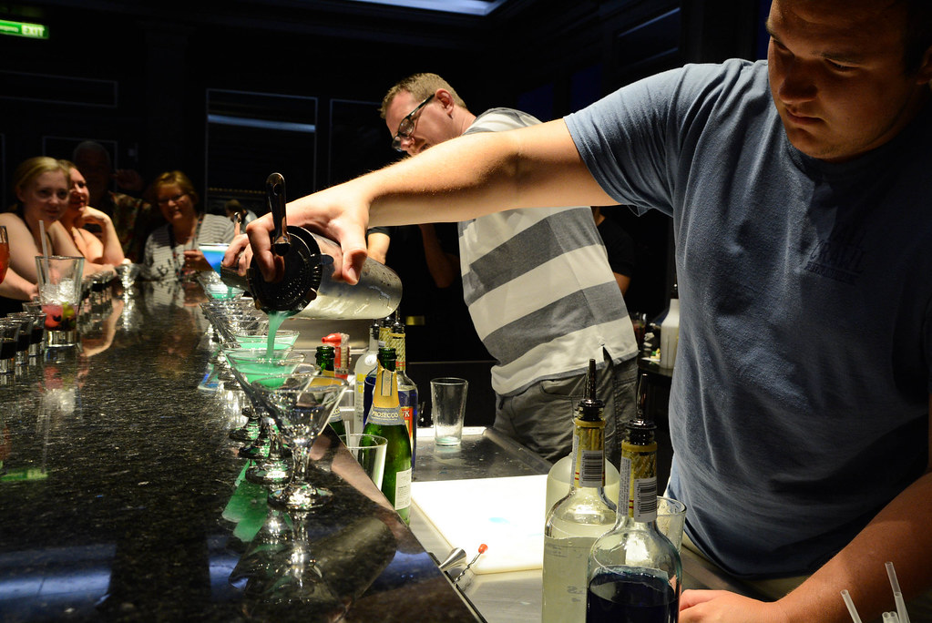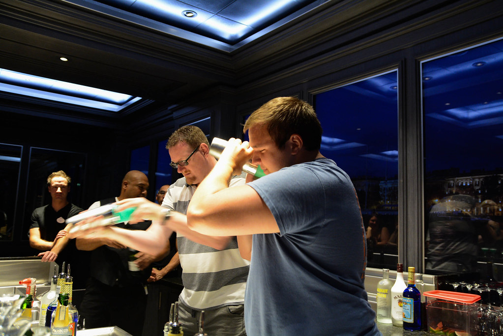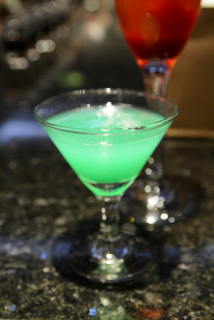 Max decided to have another go and make the Paris 75, from the Paris section of the menu at the Skyline Lounge, which he was really excited about. It consisted of Grey Goose Citron, peach schnapps, blue curacao, pineapple juice, sugared rum, and a souvenir glow cube. We didn't get glow cubes because ours were served in smaller glasses, but Arthur did make one regular-sized Paris 75 to show us.