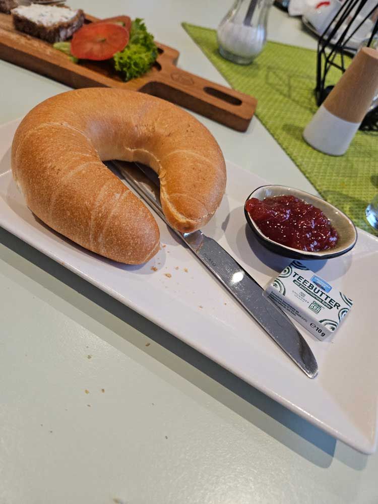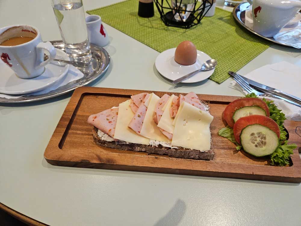 This morning at breakfast I wanted to try something different than the standard 2 rolls, ham, cheese, butter, & marmalade breakfast. This was called Butterbrot mit Käse und Wurst. or in English bread with boursin spread, cheese and deli meat. I also got a soft boiled egg.
