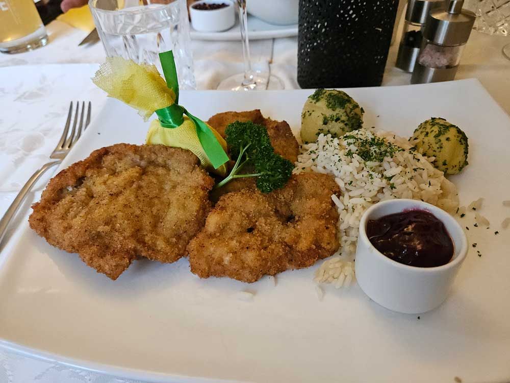 Then I got my Wiener Schnitzel. I know, it's not politically correct to eat veal, which is why I only had it this once. Most everywhere else had ‘“Wiener Schnitzel” Auf Schwein’ which means that it's made from pork. This is how I would make it at home for Fran and I. Wiener Schnitzel is another proprietary item that can only be made from veal in Austria. Otherwise you have to say its "like” Wiener Schnitzel.