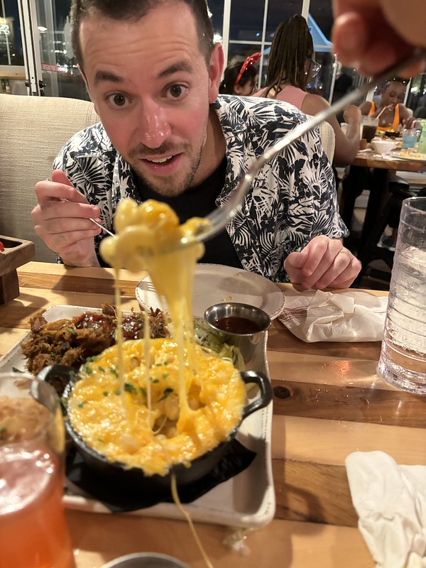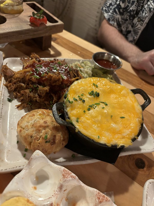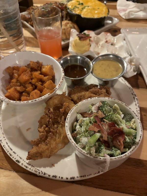 Jake and I decided to order a variety of things and pick on everything between the two of us. Jake went with the Chopped Pork BBQ Plate, which came with a biscuit, slaw, and a side of mac and cheese! I had the kid’s chicken tender meal- the waitress was really sweet and allowed me to order this as an adult. This came with two sides, so I chose the roasted sweet potatoes