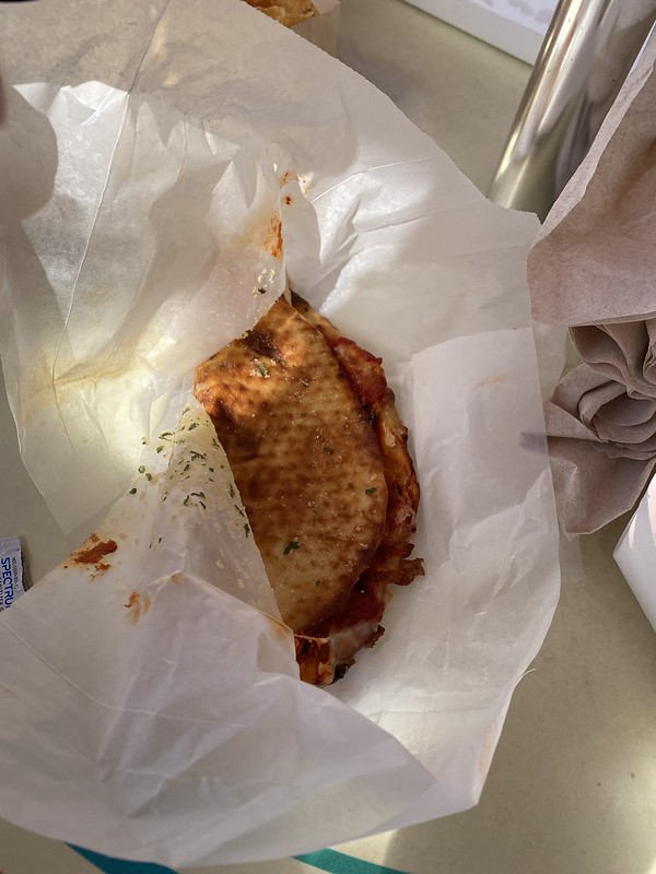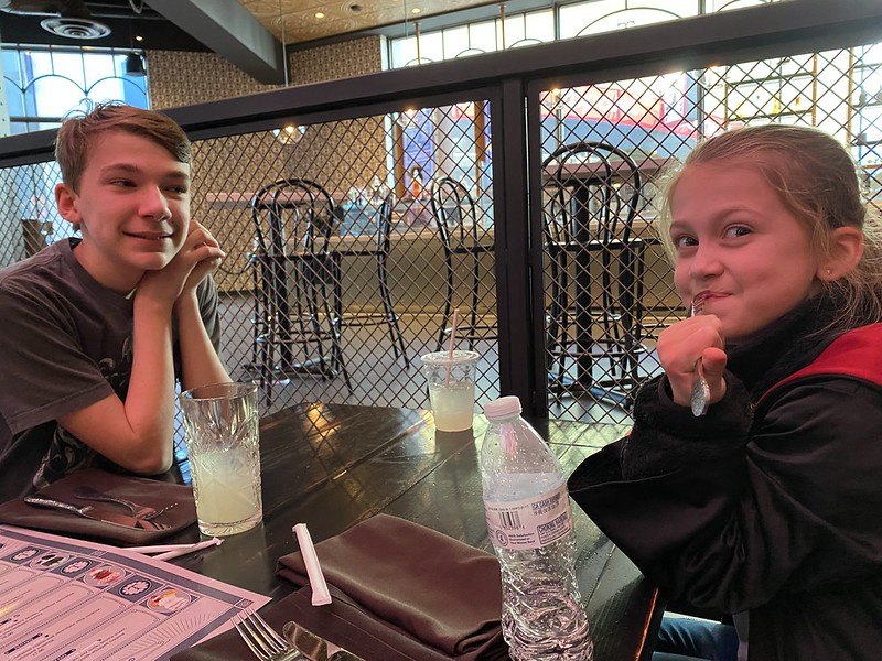 While DH waited in line to get our lunch, the kids and I had a seat off to the side in a little bit of shade to apply sunscreen because it was starting to warm up and the sun was really out. DD asked what we were having for lunch and I explained that it was called a pizza flop over. Then she started complaining that her feet were hurting, and DS quipped, “They might pizza flop off.” He really gave us a good laugh! It really hit us in the funny bone!