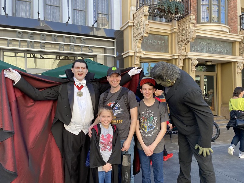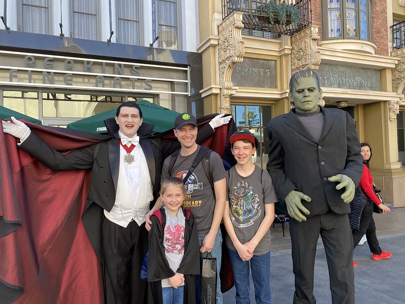 As we left the shop, DH spotted Dracula and Frankenstein wandering around and wanted to go see if he could get a picture with them, so we followed them for a bit. When we got over by them, DH and DD went over to take a photo, but DS didn’t want to go over. Both Dracula and Frankenstein kept encouraging him to go over, so once he finally did, Frankenstein kept staring intimidatingly at him. It was so funny!