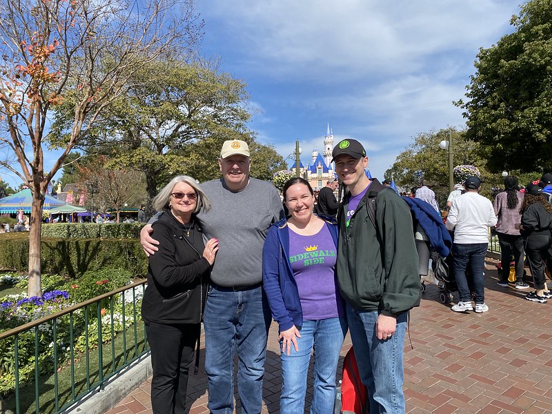 A couple of days earlier on Facebook, I found out that one of the couples we traveled with on our Adventures by Disney in 2012, Jim & Linda, would be in Disneyland this same day before they got onto a cruise ship. While we were finishing up on this ride, I got a text from Linda that they had just arrived into the park and would be near the hub if we wanted to meet up, so since we were pretty close we figured this would be the best time to see them. It was SO nice seeing them and chatting with them again! It was like we picked right up where we left off. They were heading onto a cruise with a lot of our other ABDer friends, so we wished them safe & fun travels after talking for a bit and then got DS to take our photo together.