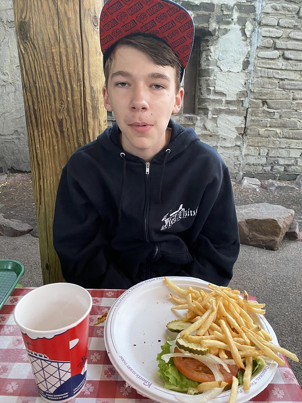 DS didn’t want to ride, so we found a picnic table nearby for him to wait, and DH, DD and I went to get in line. However, we messed up a little and didn’t pay attention to the height requirement and missed that this one was 54”. Luckily, we didn’t wait long before we got to the measuring spot and found out DD wasn’t tall enough. I told DH to still ride and took DD off to go back and wait with DS for him to finish.