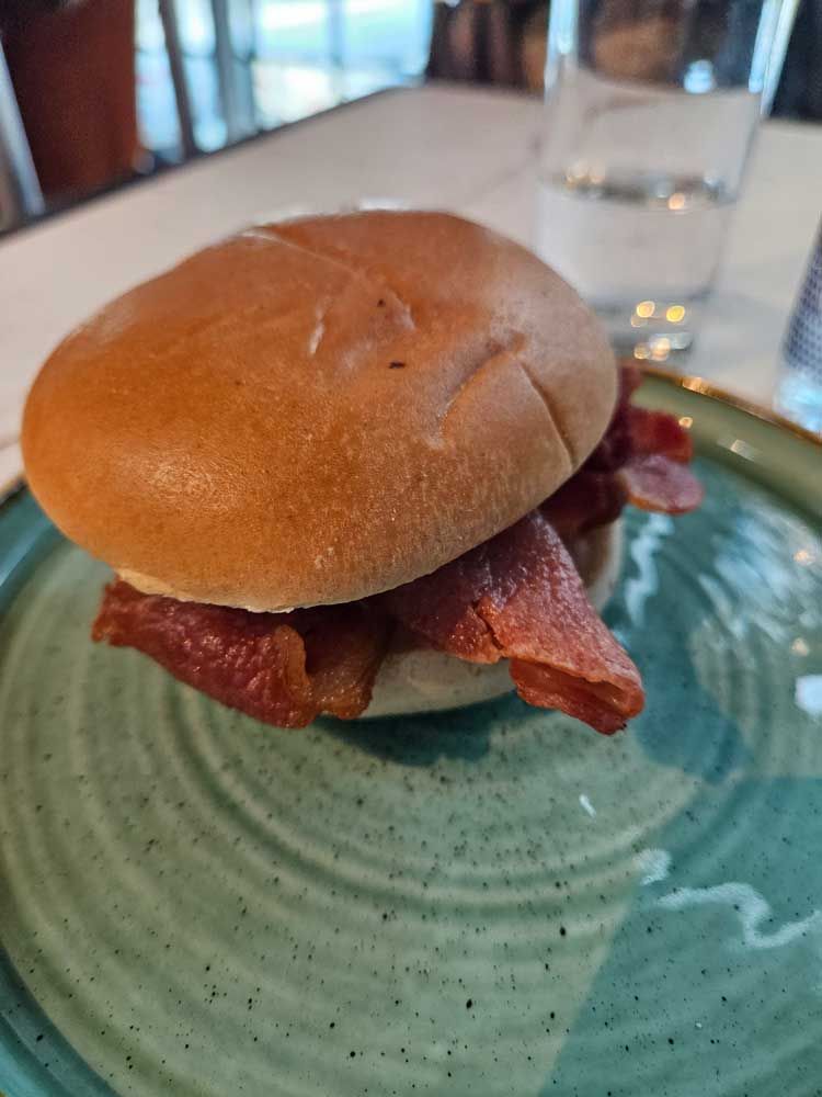 We got to the location of our gate and I wanted some water. Jill said we had time to go up to the lounge and get free water. We also had time to see if there was some quick food available. I filled my water and then went to take a look at the food. They were in the process of changing over from breakfast to lunch. Like so many places nowadays they had examples of what they were serving displayed on plates. I saw a bun full of bacon and asked what that was. It was simply bacon on a brioche roll. Actually it was just a hamburger bun, but brioche sounds fancier. Perfect! I'll take it. I practically ran back to the table and told Jill to go get one. Neither of us really ate the bun, we just enjoyed the yummy porky goodness.