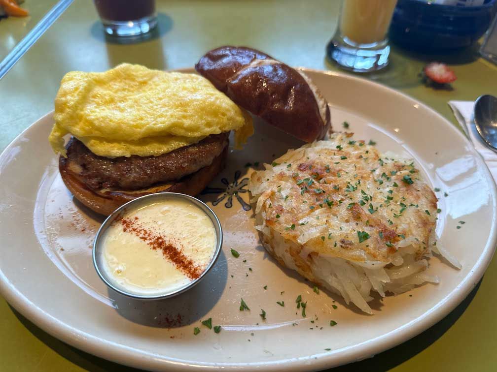 She got the Sandwich I Am, with sausage and egg on a pretzel roll.