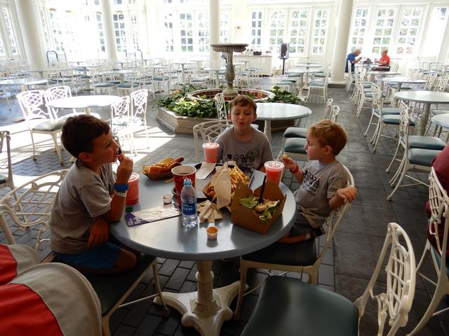 We were headed to Epcot of course and in need of some lunch after our mediocre breakfast. We entered through the International Gateway and headed straight towards America. We figured Liberty Inn was the easiest choice for the boys, although I would have to loved to eat somewhere more adventurous, this was the perfect stop for us. We ordered two adult orders of the chicken nuggets, a salad for me, and the mac and cheese hot dog for Joe, along with a Coke and three cherry icees. This used up 4 quick service credits and was the perfect meal to get us all back in good spirits.