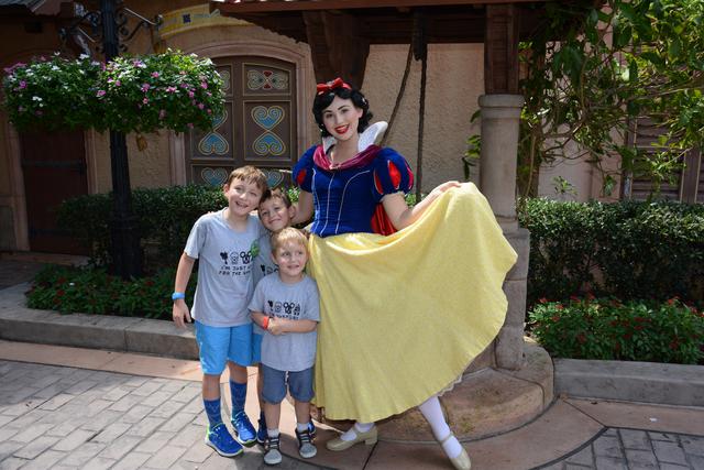 N spotted Snow White and he asked if we could meet her. We haven’t been the kind of family that stops for meets that we see out and about, because they always seem so long and they’re always in the heat. But N was finally happy, and there was no harm in stopping. C and J did not want to meet her, which was sad but not surprising. I figured they would get to the age where meeting princesses was no longer their thing. However, as soon as I pulled out N’s autograph book, C and J quickly changed their minds. I had made personalized autograph books for them, and they wanted to fill them up, so I guess they weren’t too cool for princesses. I think we only waited about 15 minutes and the boys were meeting the first Disney princess of the trip.