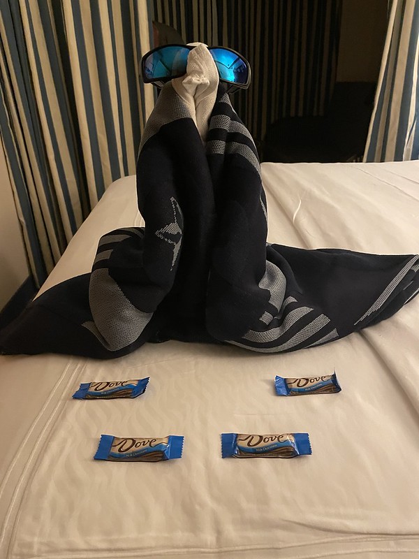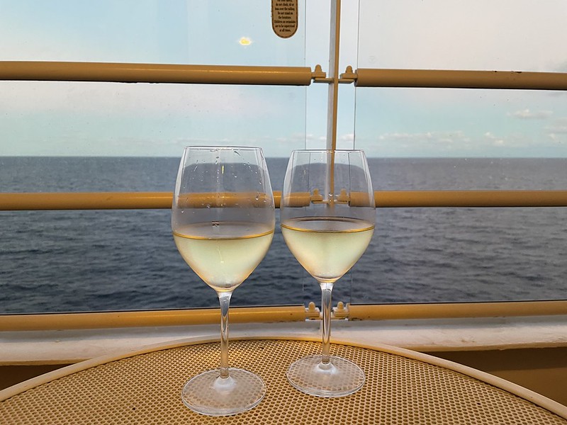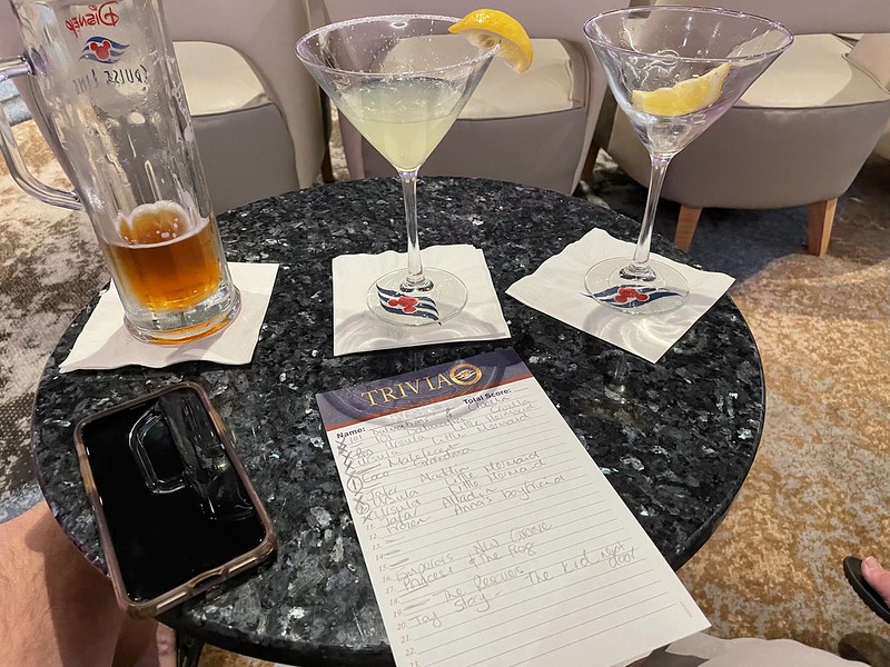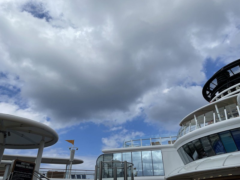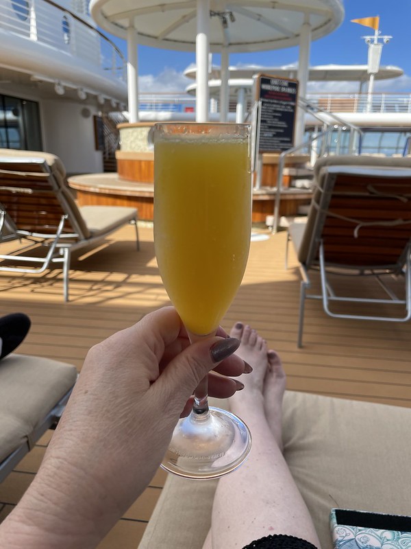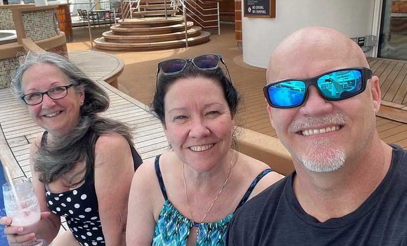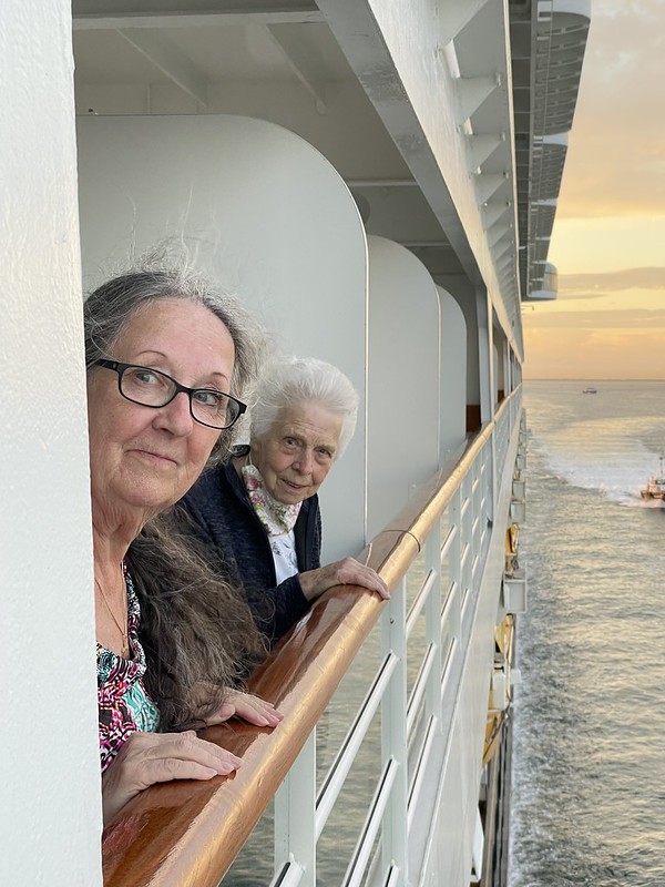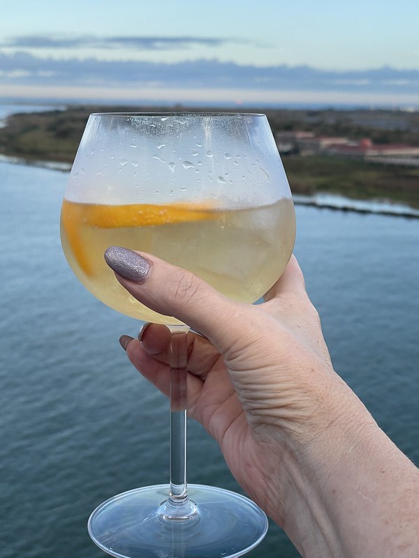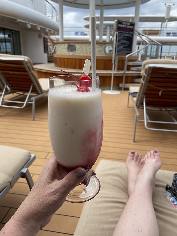 I popped down to guest services and picked up the extension cord and dropped off Bruno‘s gift. My timing was perfect because by the time I got back Scott was pretty much done with unpacking. HA HA. After Mum and Maureen got finished with their unpacking, we went up onto deck 9 for a peek at what was going on around the ship. And of course, get our first drinks! A Pina Colava for me and Maureen and a beer for Scott. We sat in the Cove area and while we were there they did the muster drill. I hope they never go back to the pre-Covid muster – it was so awesome to just watch it on the app on my iPhone while we sat and enjoyed our beverages. They do still shut down all the ship services while it is going on, so you have to make sure you have your beverage first.