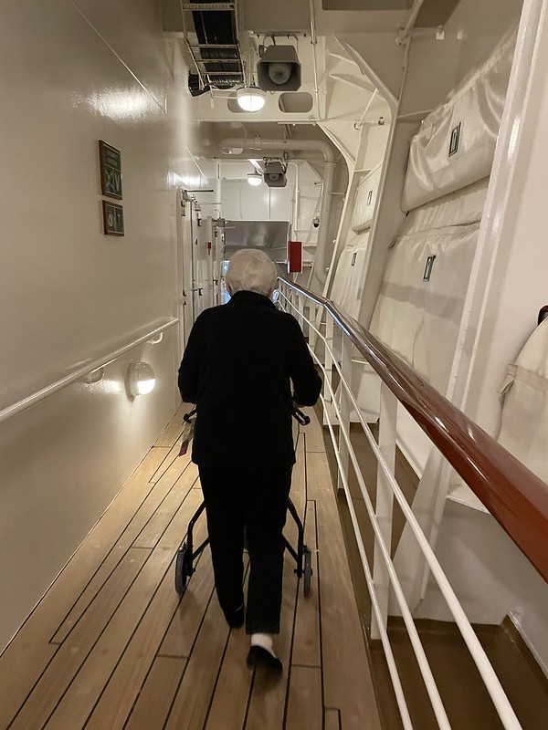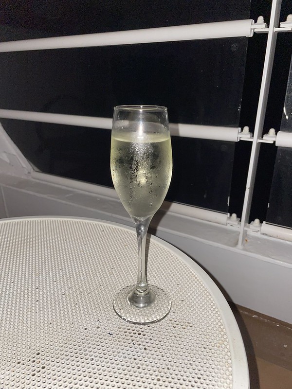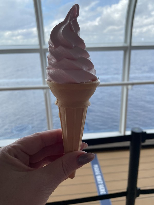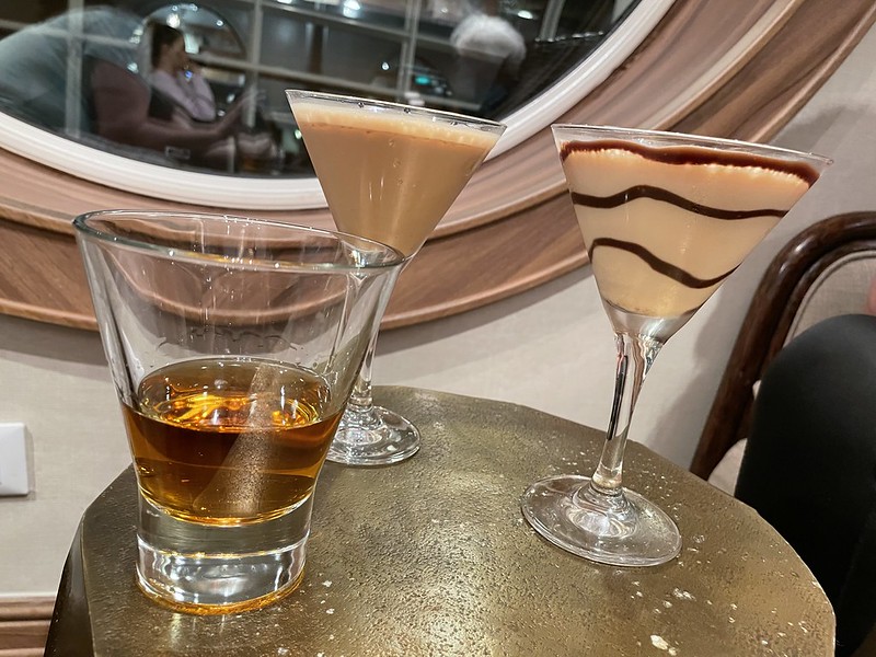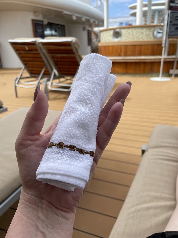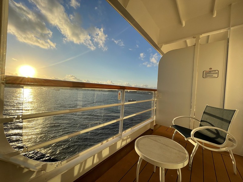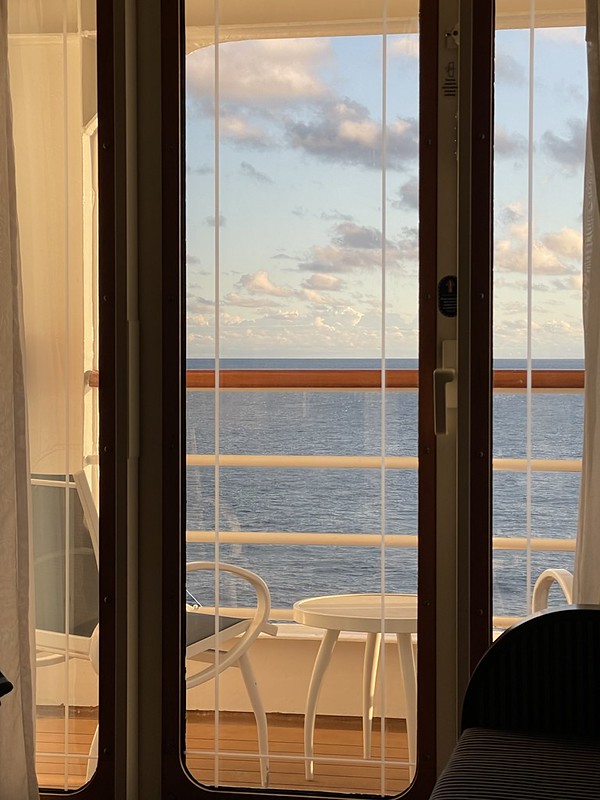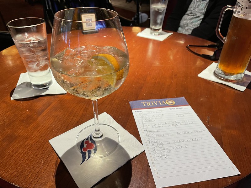 I popped down to guest services and picked up the extension cord and dropped off Bruno‘s gift. My timing was perfect because by the time I got back Scott was pretty much done with unpacking. HA HA. After Mum and Maureen got finished with their unpacking, we went up onto deck 9 for a peek at what was going on around the ship. And of course, get our first drinks! A Pina Colava for me and Maureen and a beer for Scott. We sat in the Cove area and while we were there they did the muster drill. I hope they never go back to the pre-Covid muster – it was so awesome to just watch it on the app on my iPhone while we sat and enjoyed our beverages. They do still shut down all the ship services while it is going on, so you have to make sure you have your beverage first.