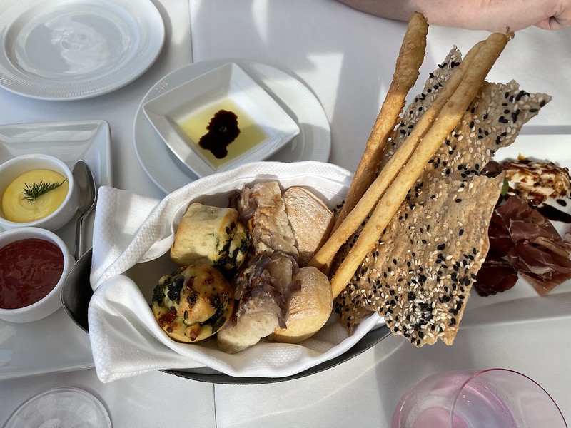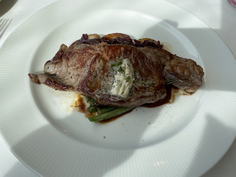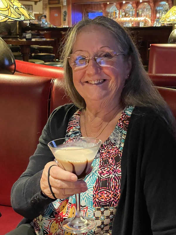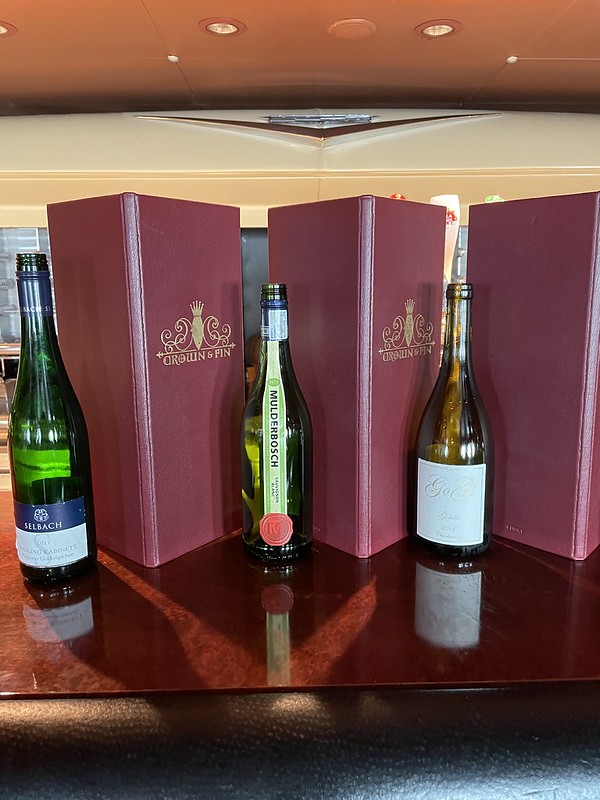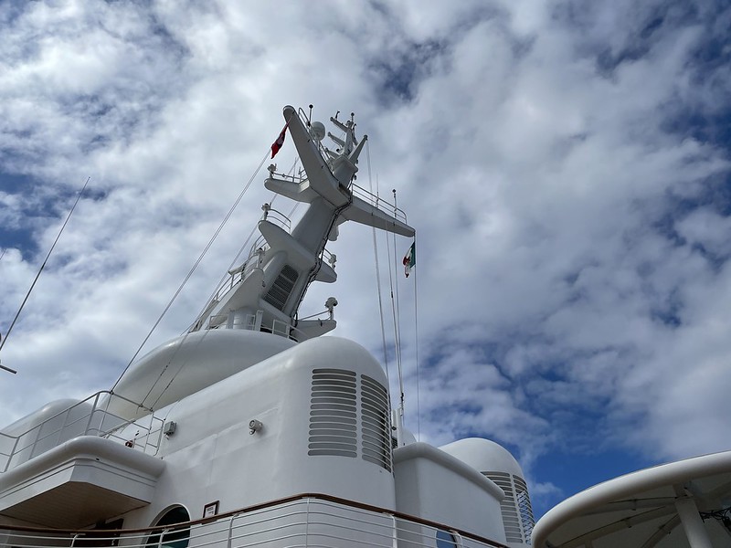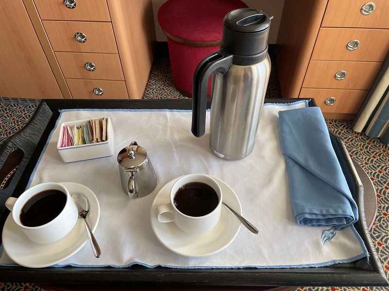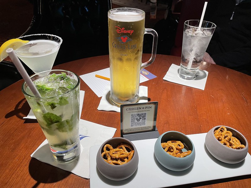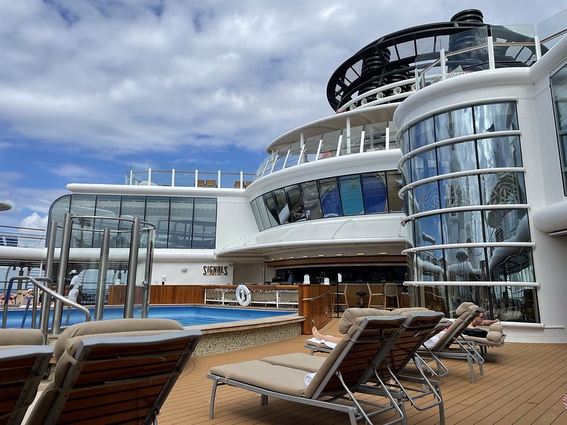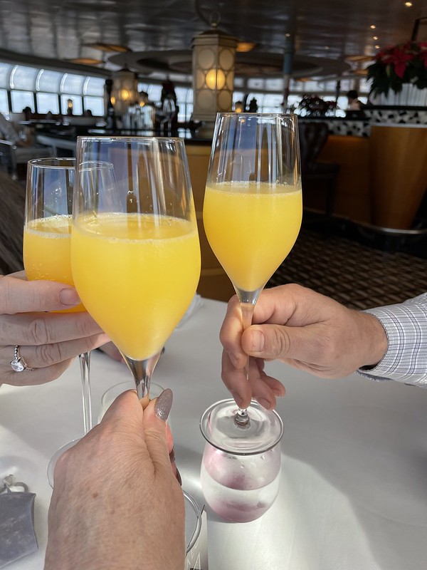 I popped down to guest services and picked up the extension cord and dropped off Bruno‘s gift. My timing was perfect because by the time I got back Scott was pretty much done with unpacking. HA HA. After Mum and Maureen got finished with their unpacking, we went up onto deck 9 for a peek at what was going on around the ship. And of course, get our first drinks! A Pina Colava for me and Maureen and a beer for Scott. We sat in the Cove area and while we were there they did the muster drill. I hope they never go back to the pre-Covid muster – it was so awesome to just watch it on the app on my iPhone while we sat and enjoyed our beverages. They do still shut down all the ship services while it is going on, so you have to make sure you have your beverage first.