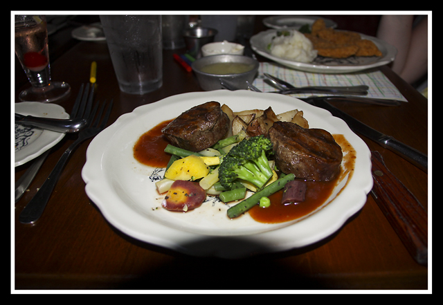 Very nice ending to your trip! What fun to see the Red Coats doing a little bit. I often wondered how they fought wars in that get up they wear. I know the drums had to do with military strategy, but that is about it. Your dinner looks great! I really want some steak right now!