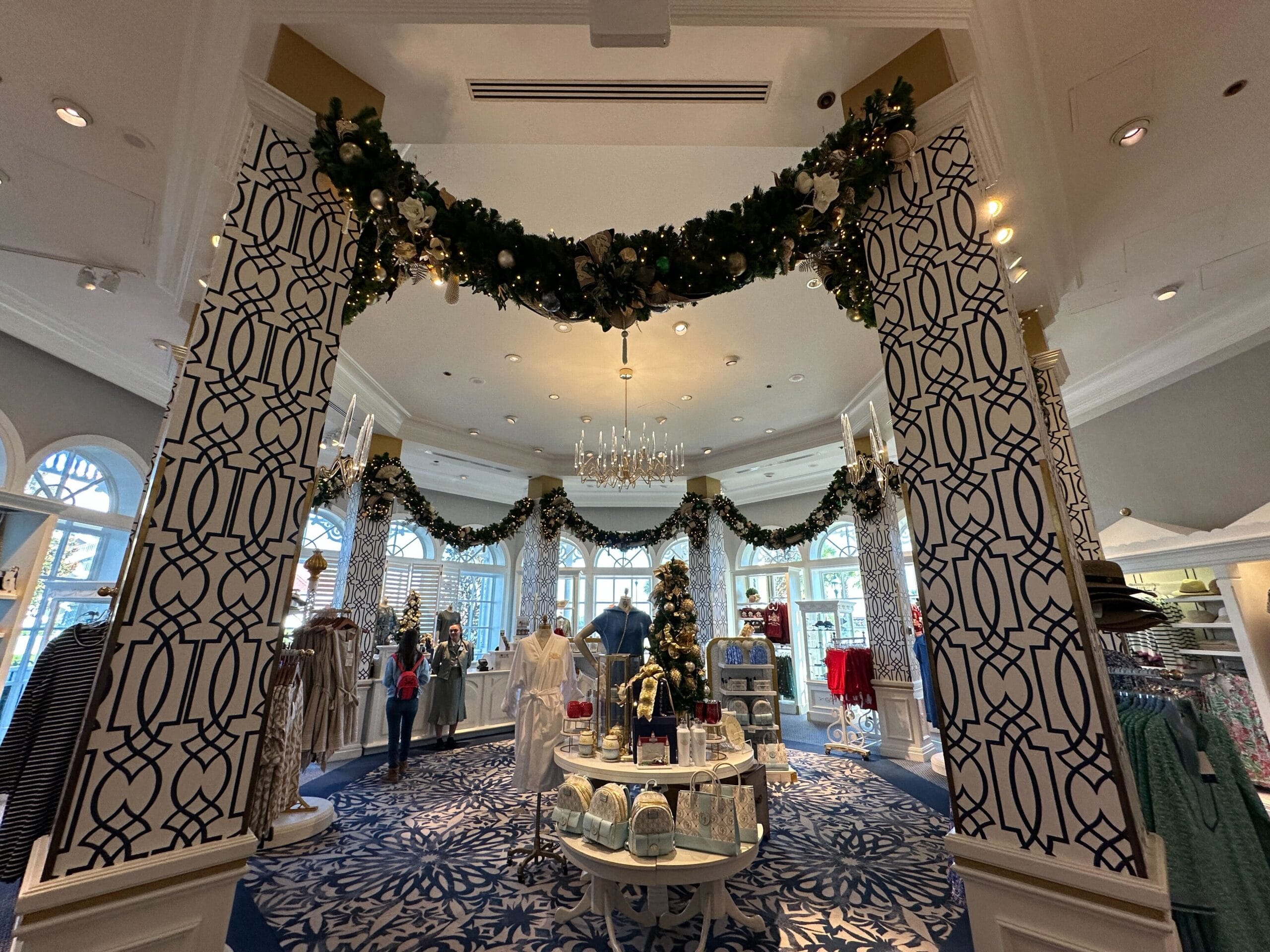 Several stores are also decked out for the holidays with garland, smaller display trees, and wreaths.