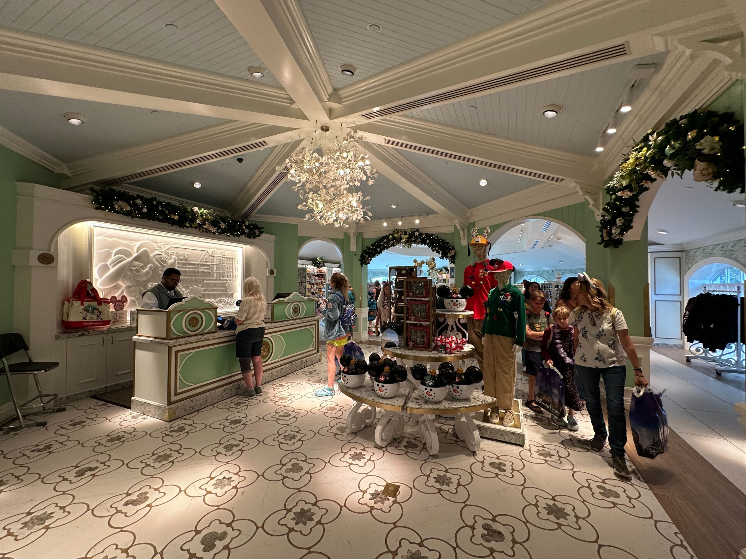 Colorful holiday carousel with festive decorations inside Disney resort.