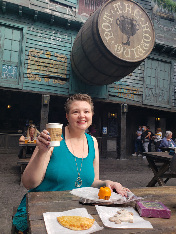 Back in line with her and then I did the “hover” for a table. She got her hot butterbeer and I got a Dragon Scale along with a pumpkin pastie and two other treats