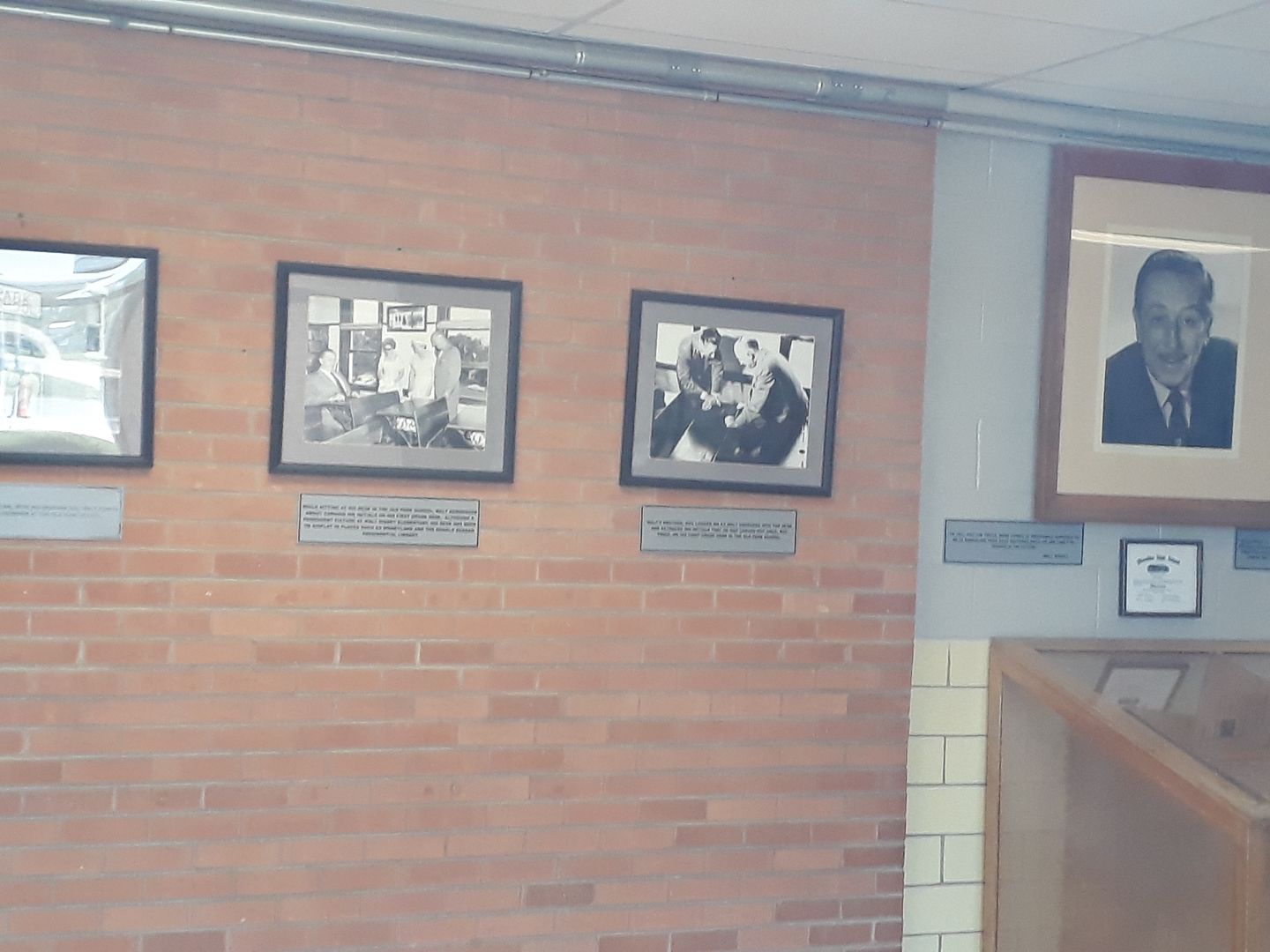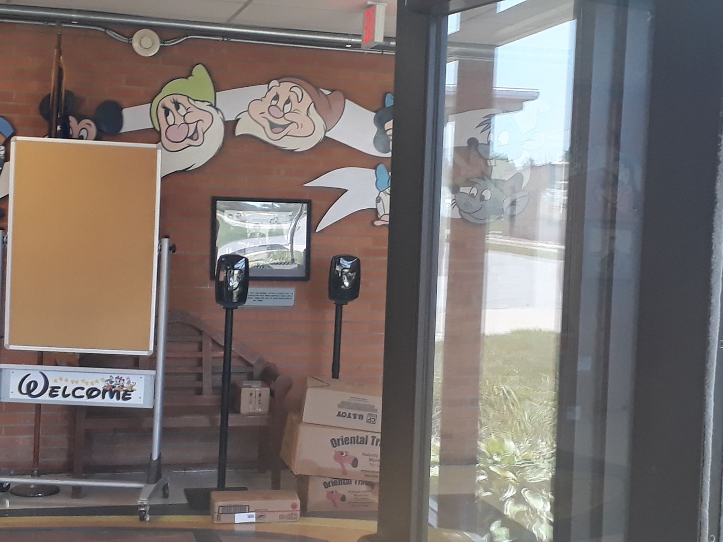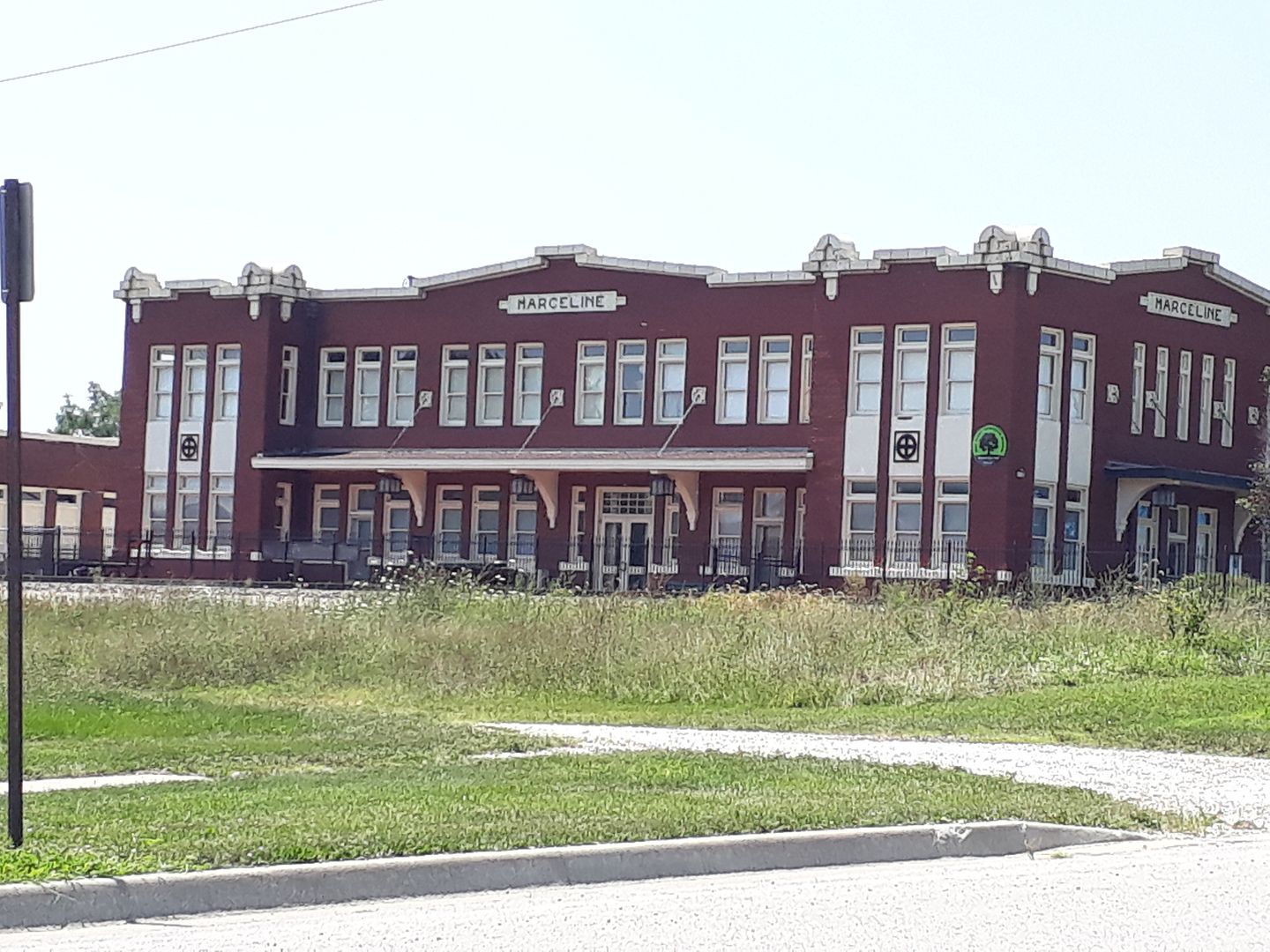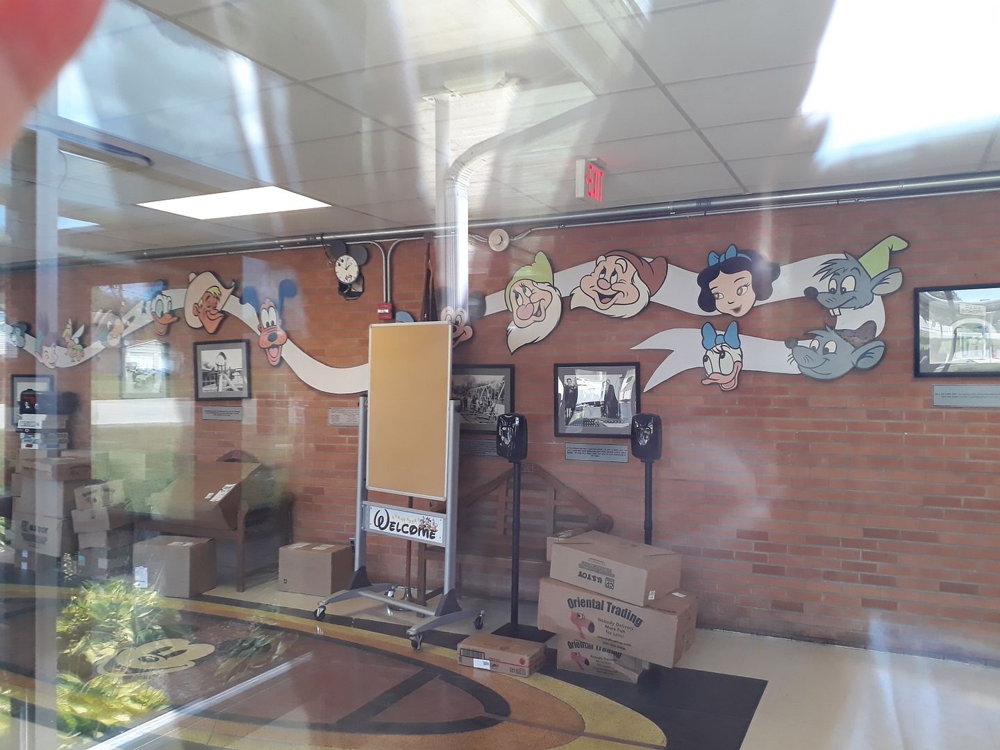 After lunch we scattered so I crossed over the tracks to check out the Walt Disney Elementary school named for Walt in Marceline. It was built in 1960 and replaced the elementary school that Walt had attended. He was thrilled that the town asked him if they could name the school after him. Being a summer Saturday, the building was closed up, but through the entrance windows you can still see some of the Disney art in the hallway.
