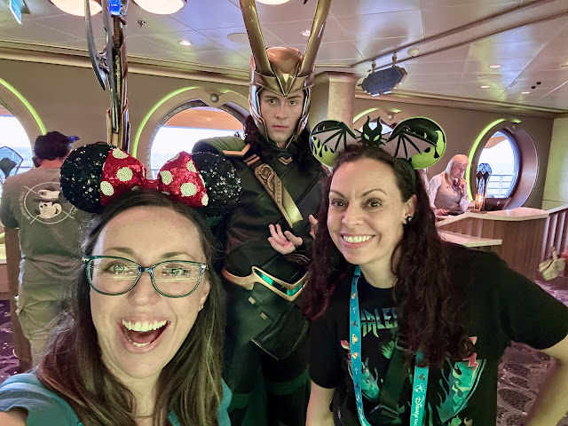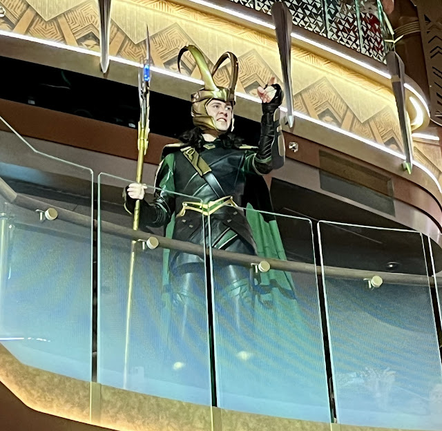 After the sail away party (during which we had already set sail) Heather returned to the room to continue to organize her belongings and I went to the atrium for the “Legend of Loki” in which two storytellers told his story and then he came out for an appearance to tell them they had it all wrong and so forth. These storytellers popped up for various stories throughout the cruise, but this was actually the only time I went to one of their shows. After this I ran into Courtney, who I had learned a few days earlier would be on the sailing—she used to be my daughter's theatre teacher. We caught up a bit and then Loki passed by so of course we took a selfie with him.