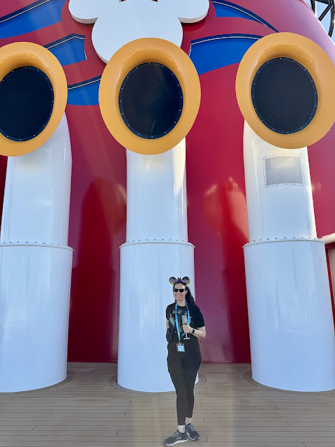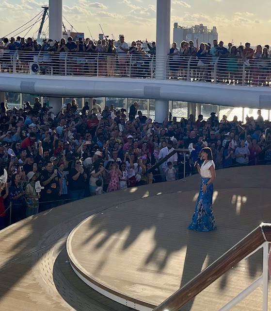 After the drill, we went up to the top deck to attend the sail away party. I haven’t gone to one in a while, but again, this seemed like a unique situation so we both decided to go. I’m glad we did because not only did we have a great spot to see all the characters, Susan Egan came out to kick things off. (Susan Egan is the godmother of the ship and you may know her as the voice of Meg from Hercules as well as Belle in the original cast of Beauty and the Beast on Broadway.)