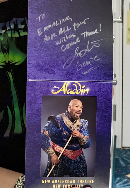 “Excuse me, may I ask you a favor?” I say. He sort of looks at me quizzically, maybe wondering where this is going. I tell him about my DD and that she’s currently applying to colleges for Musical Theatre. I explain that Aladdin was the first ever show she saw and how much we loved it. I produce the photo and ask if he might sign it for me. He’s delighted. He signs it and is so kind and gracious. He then says, “Do you have your phone on you?” I affirm that I do and he orders me to hand it over, which I do. He opens up the camera and records a video message for her. I’m absolutely dying. I thank him and we take a selfie and I’m just over the moon. What a great guy.