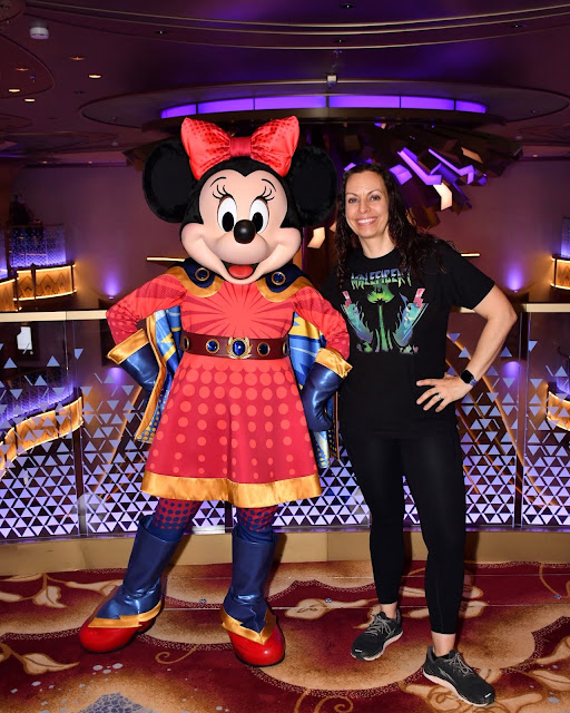 We left there and got in line to meet Minnie Mouse in her new Hero costume. The line was already long, even when we got in it 15 minutes before her meet was scheduled to start. She spent a lot of time with each person so things took a while and, spoiler alert, nearly every character meet was like this during the cruise. Long, long wait, but many of the characters were unique and they really tried to make the experience with each person unique and personal so I didn't mind.