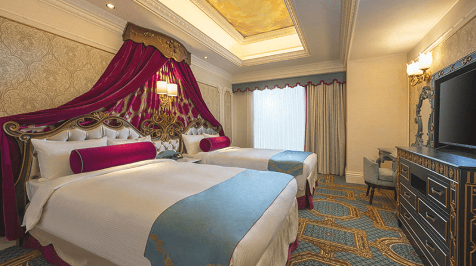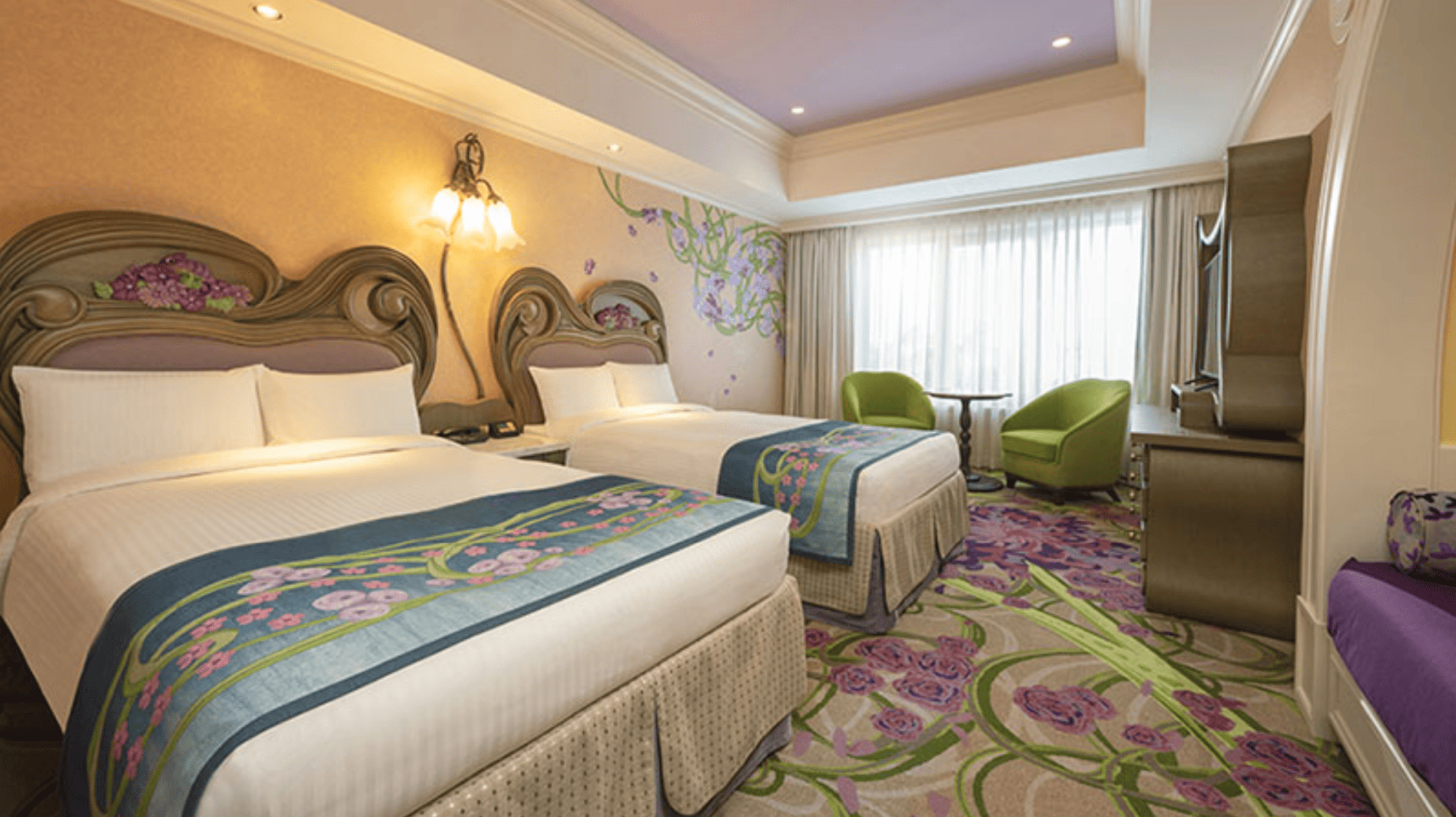 Fantasy Chateau has a total of 419 rooms. The rooms are decorated with motifs of Disney movie characters such as “Rapunzel” and “Bambi” and flowers everywhere, such as wallpaper and lighting fixtures. In addition, the guest rooms are divided into four types depending on the location (side): Bay Area Side, Hotel Entrance Side, Rose Courtside, and Spring Side.