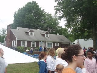 The neighbors all seem thrilled for the Hills. All the residents in the immediate vicinity have been given passes. This is a through street, but all other vehicles are barred from entering, and since the entire thing is staged, the street is obstructed anyway. There has been lot of rain recently, as most of you know, and I for one was glad that I wore my old sneakers and jeans today. There is MUD everywhere. The lawns of the neighbors that have been used as a spectator area and walk way, are ruined, but I have no doubt, they will be nicer than they were to start with. There are tents for food, equipment, dining, design and cameras on trolleys in the street. There are flood lights in the back yard and there has been a lot of excavation there. A large trap rock drive was made between the Hill's and the adjacent neighbors and it straddles both yards. I would say that the yards of at least 5 neighbors are directly impacted.