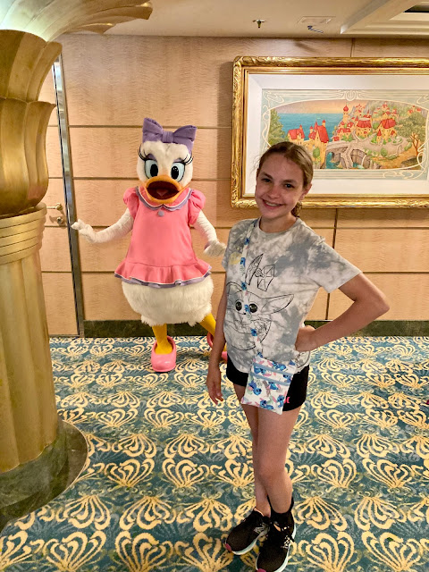 After Emmaline was cleaned up, she went off to Vibe while Roger and I sort of had a chill rest of the afternoon. We rested and relaxed and I worked a little on my trip report. Then we ventured out and had a look at our photos in Shutters, grabbed a snack up by the pool and then went up to check out the wine list at Meridian. Emmaline ran into a wandering Daisy and snapped a photo on her way back to the room. Again, lots of characters out in the wild on this sailing.