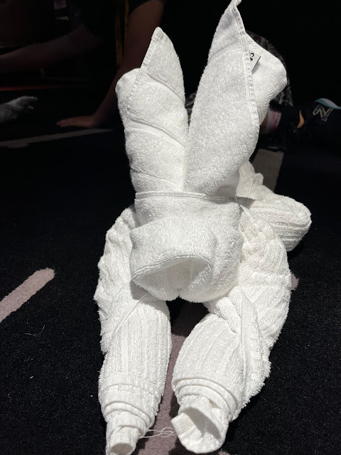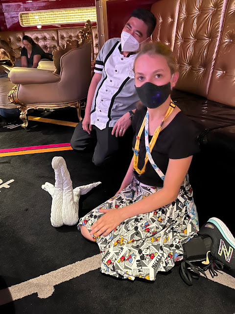 Finally we had a moment for lunch, which was fine that it was late because we had a later breakfast and we have late dinner so it worked out. After lunch outside at Cabana’s, we went to The Tube for a towel folding class. We had a lot of fun making elephants, rabbits, monkeys and swans out of towels!