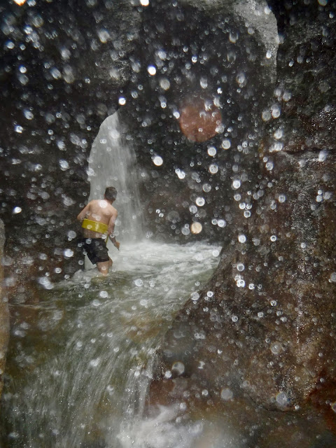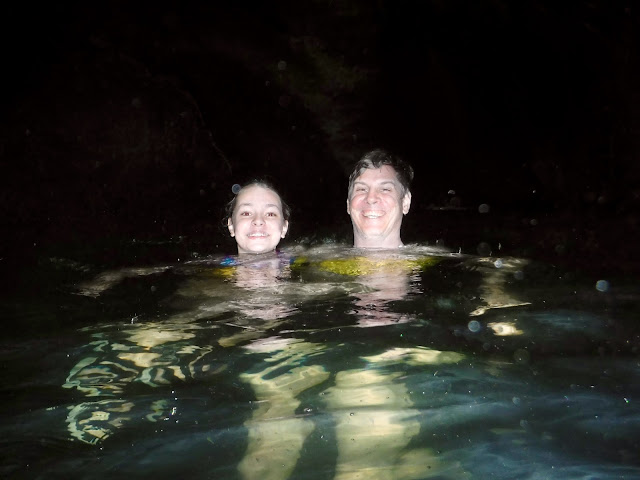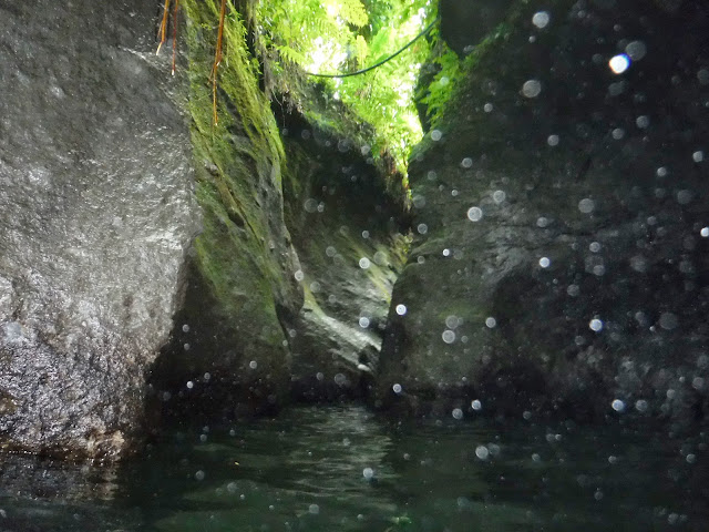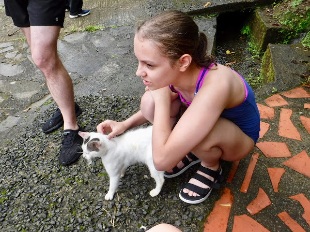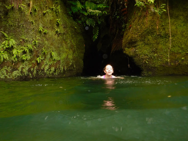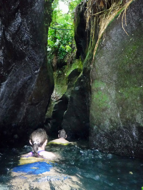 We all agreed after that Titou Gorge was a highlight of our entire trip (and none of the photos do it justice in the slightest). Jean-Marie got us all into some floats (Emmaline befriended a cat named Puss Puss while we waited for him to get the floats). Snorkeling floats or life jackets are required - the current is strong in places. Then he showed us where to go and we made our way into the cold water and into the gorge. It was so cool inside. Emmaline was a little hesitant to go in, but I reminded her of something Will Smith said in his recent show on National Geographic: he said that his grandma told him that some of the best things in life can be found on the other side of fear. So she nodded and went in. There were basically three different “rooms” inside the cave-like area. It’s not really a cave, because it’s slightly open on top with a little crack letting light in. In the third room at the very end was a waterfall. There was a strong current from the waterfall pushing into the middle room and Emmaline didn’t feel comfortable traversing it (she took her brace off for the swim into the gorge) so I waited outside with her and we just sort of peeked inside. Roger went in and checked it out and got some photos (none of which came out due to the water spray).