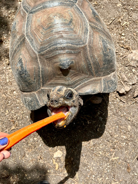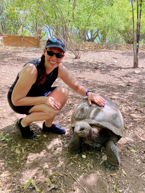 We got up and got ready and met on the dock right on time. Like before, we sailed out around the island for about an hour and one of the three guides onboard pointed out different interesting things along the way. We arrived at Lavisount Island at around 10 AM where they have a rescue preserve for tortoises. They were super friendly giant tortoises that loved getting neck and shell rubs and were pretty excited about having carrot snacks. We had a lot of fun petting and feeding them before it was time for lunch. Just like a couple of years ago, we had a tasty lunch and we enjoyed it under a shade tree, just the three of us.