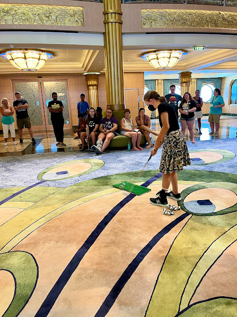 It seemed that all the activities we wanted to do for the day were right around the noon hour and kicked off with Chip It Golf in the atrium. We had never done this nor had we ever seen it so we set out with no clue what it was about. It was apparently about hitting a hollow plastic golf ball (wiffle ball style) covered in velcro onto a mat that looked like it belonged in a preschool. The mat had different point values in various areas. There were three rounds: normal play, negative play (some of the areas were negative and some were positive - this round reversed this) and double points. It was much much harder than it looked. Roger took second place (after a second place tie breaker) and won a keychain. Yay!