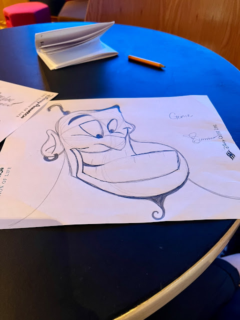 It didn’t matter to us, this was our 5th time to CC (2014, 2015, 2017, 2022) and we aren’t as crazy about it as many are. (Blasphemy, I know.) So we woke up later than usual and had a leisurely breakfast. At 10:15 Emmaline and I went to Animation Class in D Lounge (drawing) and Roger watched some TV (he watched a lot of cricket). This was actually the first time we went to one of the animation classes on this sailing, which is funny because we did a ton of them back in November on the Wonder. We drew the Genie with a fair amount of success considering we were told he’s a more advanced character to draw.