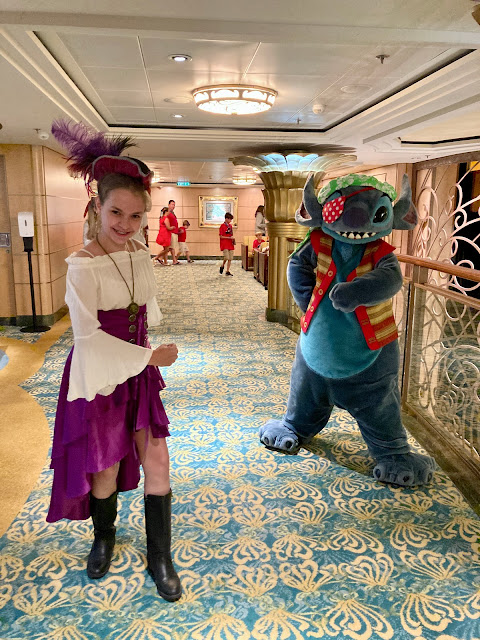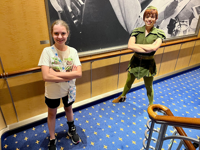 Then it was time for dinner and we were in Royal Court with a new menu we’d never had before, the “Vista” menu. No idea why it’s called that or why they served that one up, but it was actually pretty good. Apparently it used to be called “Taste of California” and it’s usually reserved for longer sailings. I really enjoyed the artichoke appetizer and I ordered both vegetarian entrees and both were really good. Slight edge to the mushroom ravioli. I’m a sucker for any kind of pasta thing with mushrooms involved. After dinner we were beat and went straight to bed. We ran into Peter Pan in the stairwell on the way to our room. This cruise had a lot more random interactions with characters just roaming around than any cruise we've been on in the past and it was a lot of fun.
