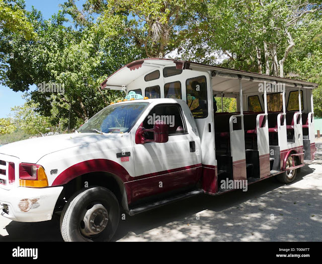 Patrick took us back to the hotel we originally met at and helped us get a taxi to go back to the ship. Back on the crazy open air taxi bus thing, we were almost back to the ship when the driver stopped to pick up a whole giant group of people who squished and piled in. They had lanyards on from a Royal Caribbean ship that was also in port that day. St. Thomas has two ports and they are not super near each other (probably 10-15 minute drive apart). After those people piled in, the driver turned around and headed back the other way. Away from the Fantasy! We yelled and called out and the other people looked at us like we had grown two heads. Finally one of them understood what was happening. Some of the people on the taxi said, “we are all on a ship excursion! We don’t want to go the wrong way!” And so the driver just said, “I’m going to the other ship!” He seemed really confused and I’m pretty sure he forgot we were even on the taxi! He let us off there and we asked, “what are we supposed to do now?” He said, “walk or wait for another taxi.” The nerve! We ended up walking back to the ship and thankfully it wasn’t too far and he had dropped us off at a bus stop so there was a bench there that Emmaline could use to put her brace back on for the walk since she had not put it on after being on the beach since we knew she wouldn't be doing any walking. It was probably less than a ten minute walk but still. The whole thing was totally weird and many of the people from the Royal ship were actually pretty rude about it - as if we were imposing on them when really we were on the taxi first! I found a stock photo of the weird taxi since I didn't take one while there.