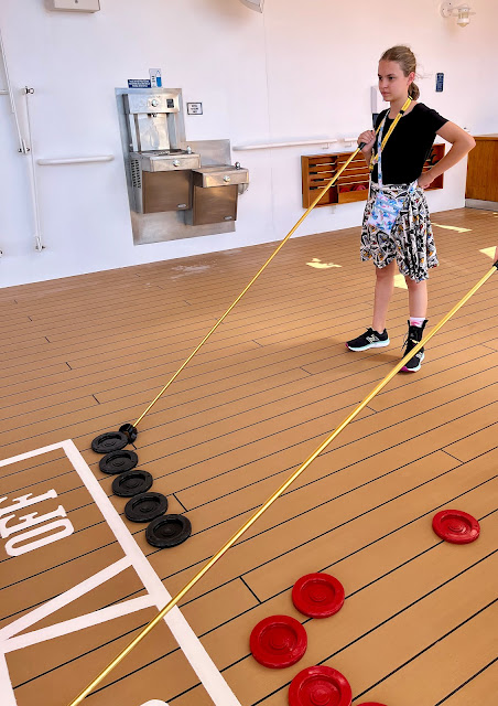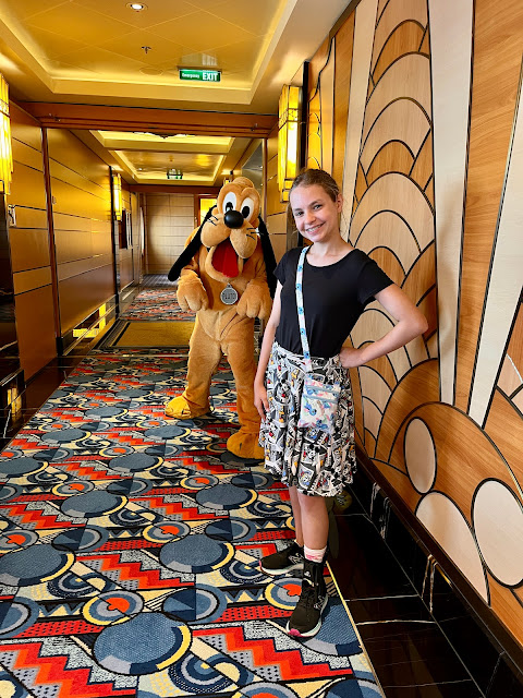 There weren’t many other activities on the schedule we were interested in so we went outside on deck 4 to try our hand at shuffleboard. Turns out, it’s harder than it looks. We were all terrible, but we had fun! After shuffleboard, we had some snacks and fancy coffee and then Emmaline and I went for one more karaoke session. I don’t remember what Roger did. Definitely not karaoke. We also ran into Pluto in the hallway near the movie theatre (which is on the way to our room so we always got to smell popcorn on the way to and from our room).