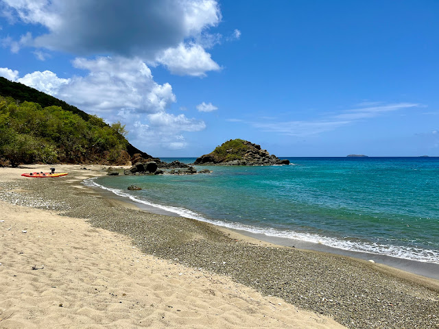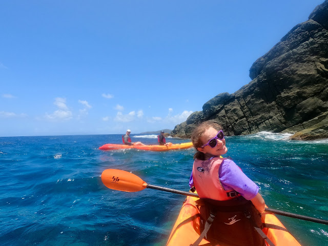 When we were done there, we hopped back into the Jeep and did some MEGA offroading (no way the route is passable with anything but a 4x4) to get down to a super secluded beach where we would go kayaking. First, we ate some sandwiches that they brought for us. They were okay at best. After lunch, we got a quick briefing on operating our kayaks and Emmaline went with our guide and Roger and I went together. I looked up the beach on Google Maps and it’s called Stumpy Bay Beach.